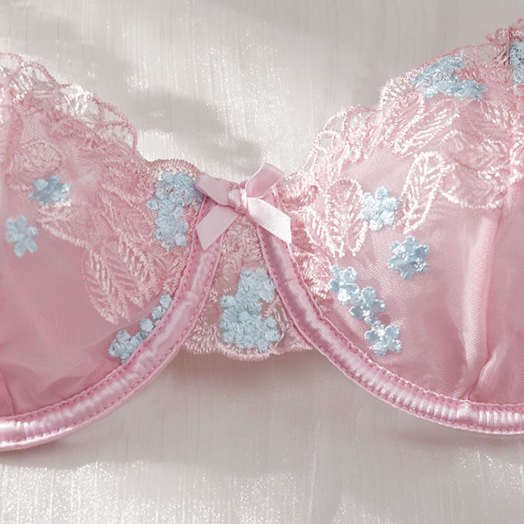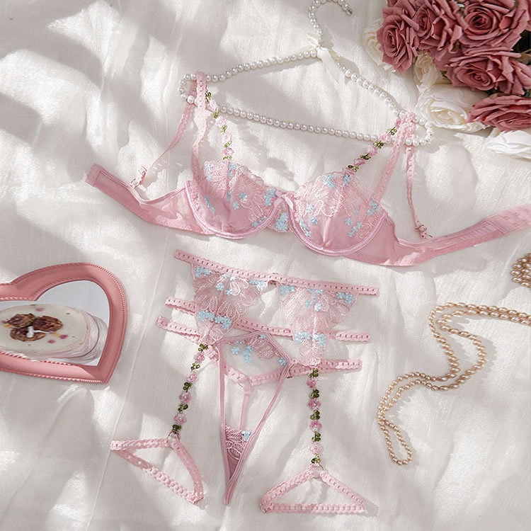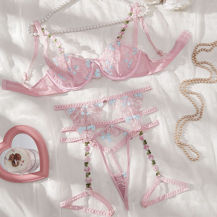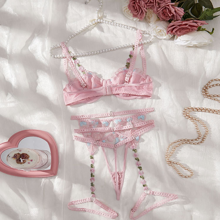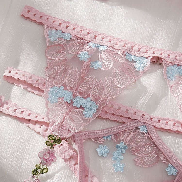 This delicate pink lingerie set features a floral-embellished bra with soft lace detailing and sheer mesh panels that highlight feminine charm. Paired with a matching garter belt adorned with rose accents and adjustable straps, it creates a romantic and alluring look. The thong-style bottom includes crisscross design elements for added flair, making this ensemble perfect for special moments or intimate evenings.