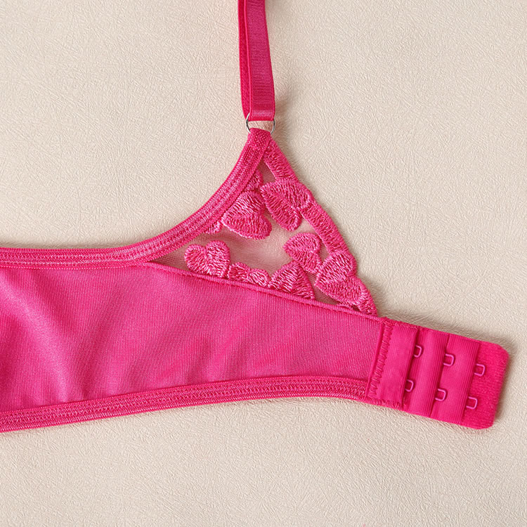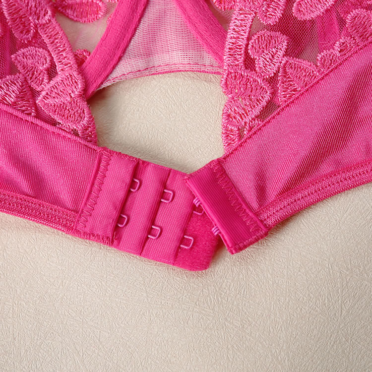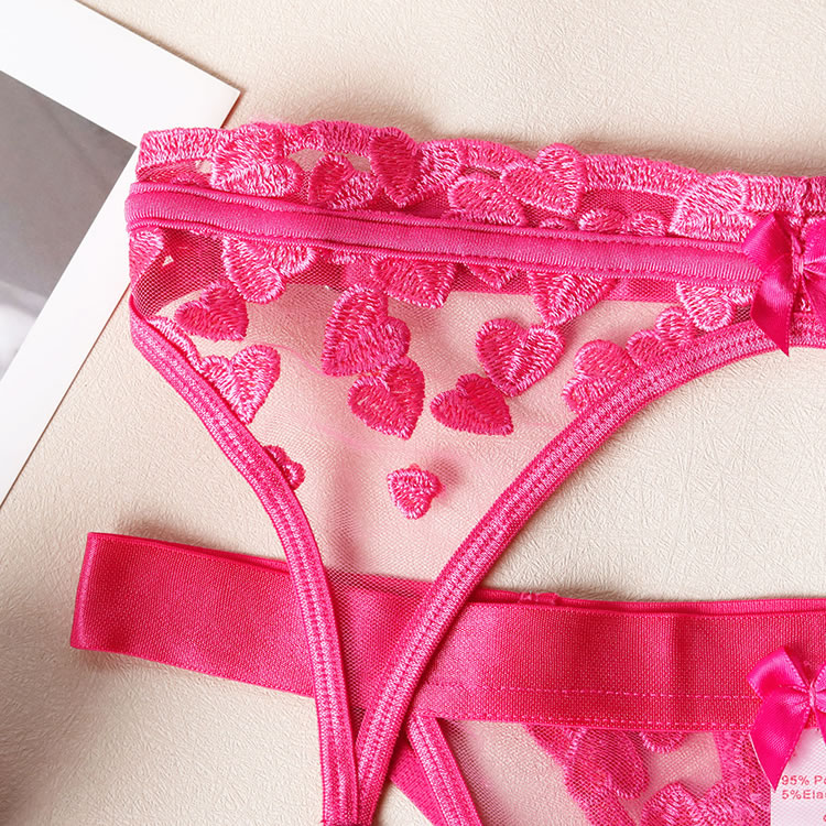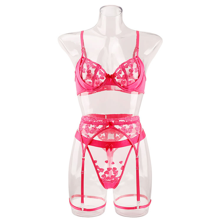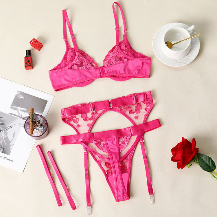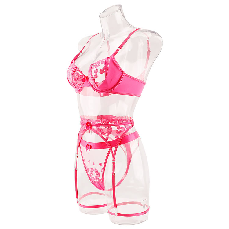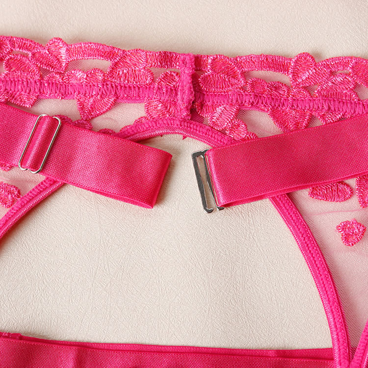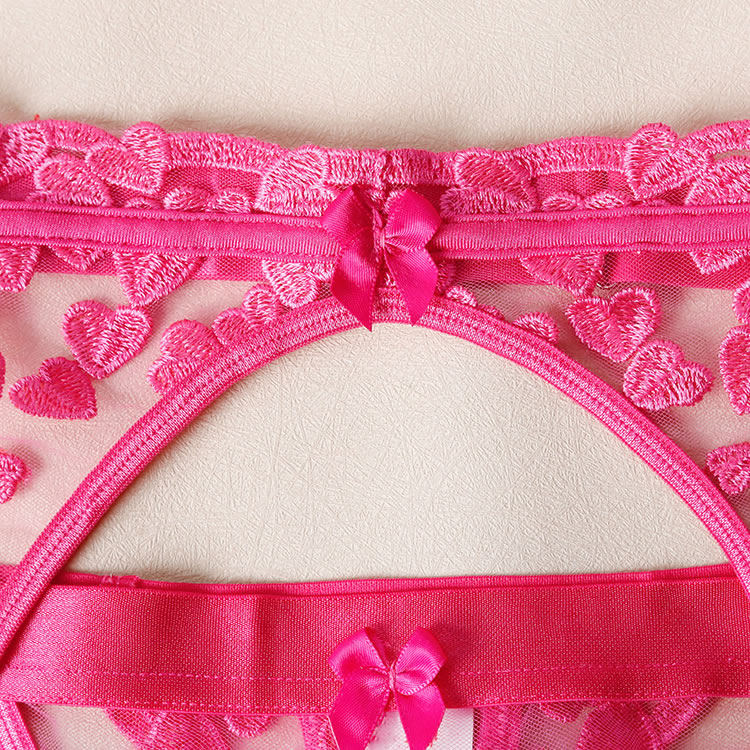 This vibrant pink lingerie set features a bold, eye-catching design with heart-patterned lace details throughout. The bra offers structured support with thin adjustable straps and a delicate lace overlay that adds romance to the look. Paired with a high-waisted garter belt that connects to matching thigh bands, it creates a full-body silhouette with flair. The sheer mesh panels enhance the daring aesthetic—ideal for those who love playful and expressive styles.