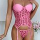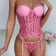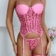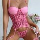 This bold pink lingerie set features a playful heart-print design with a structured corset-style bodice and adjustable straps for a customized fit. The open-back detail adds a daring touch, while the attached garter straps keep stockings in place with style. Designed to make a statement, this piece combines comfort with eye-catching flair, perfect for those who love to express confidence and charm.