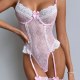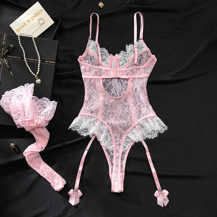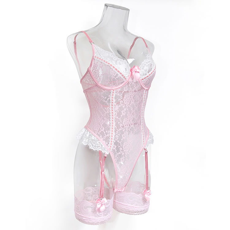 This sweet and seductive lingerie bodysuit blends soft pink mesh with intricate white lace for a dreamy, vintage-inspired look. The sweetheart neckline is accented with a delicate bow at the center, while floral lace patterns cover the bust and torso. Adjustable garter straps with matching bows add a playful touch, and the open back with a circular cutout enhances elegance and allure. Perfect for those who love a blend of innocence and boldness in their intimate wear.