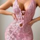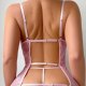 This soft pink lace chemises features a romantic floral pattern that wraps around the body in a flattering fit. The front showcases a plunging neckline with a central bow detail and a small keyhole cut-out, adding a playful touch. The back is designed with thin straps and horizontal bands that create an elegant open-back look, highlighting the natural curves. Perfect for those who enjoy a mix of sweetness and sensuality, this piece combines classic lace detailing with modern styling.