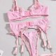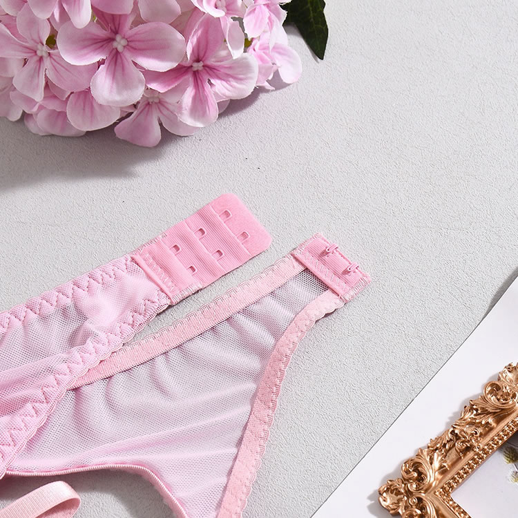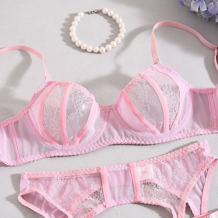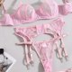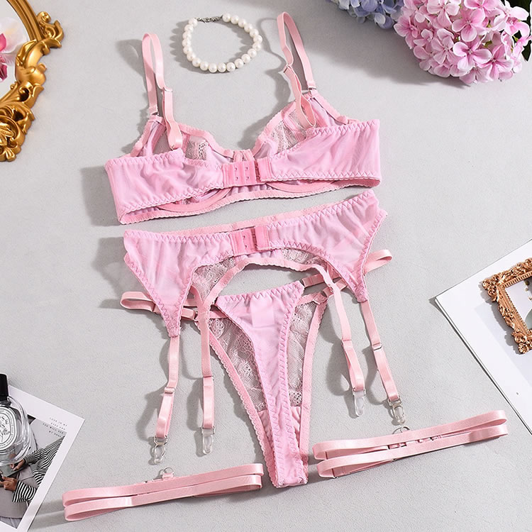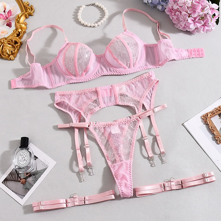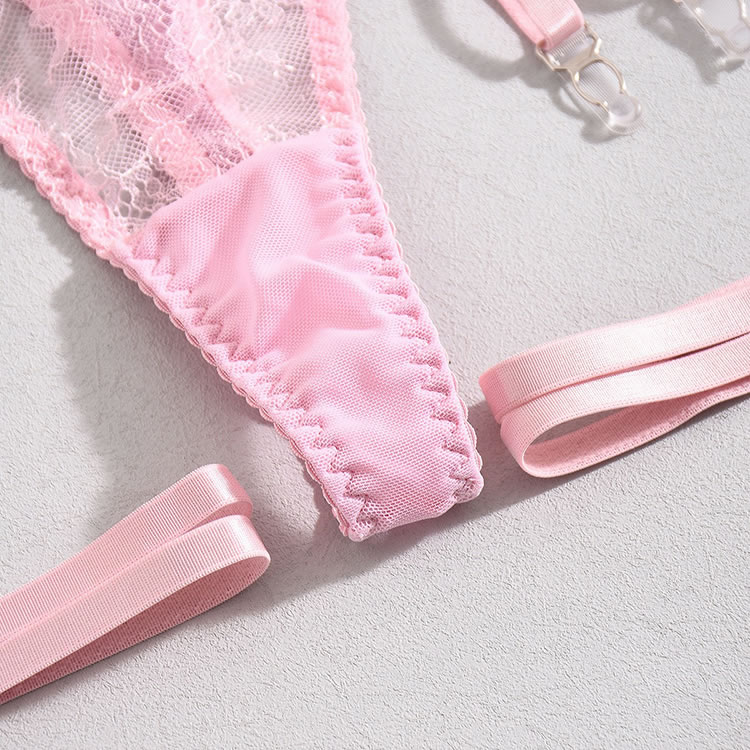 Embrace a soft and romantic aesthetic with this delicate three-piece lingerie set in a lovely shade of pink. The design features a charming mix of sheer floral lace and smooth satin-like fabric. The bralette offers support with a see-through lace cup design, while the matching high-waisted garter panty features a daring cutout at the midriff. Complete with adjustable satin straps to hold your favorite stockings, this set is perfect for a special night in or adding a touch of vintage glamour to your collection.