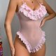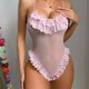 This delicate pink bodysuit blends soft romance with a touch of playful sensuality. Crafted with sheer mesh fabric, it features an oversized ruffled lace trim around the bust and hips, adding volume and charm to the silhouette. A sweet floral embellishment at the center enhances its feminine appeal, while thin spaghetti straps keep the look light and airy. The back showcases a bow-tied ribbon that ties just above the waist, creating a flirty detail that draws attention to the curves. Perfect for those who love a blend of innocence and allure.