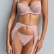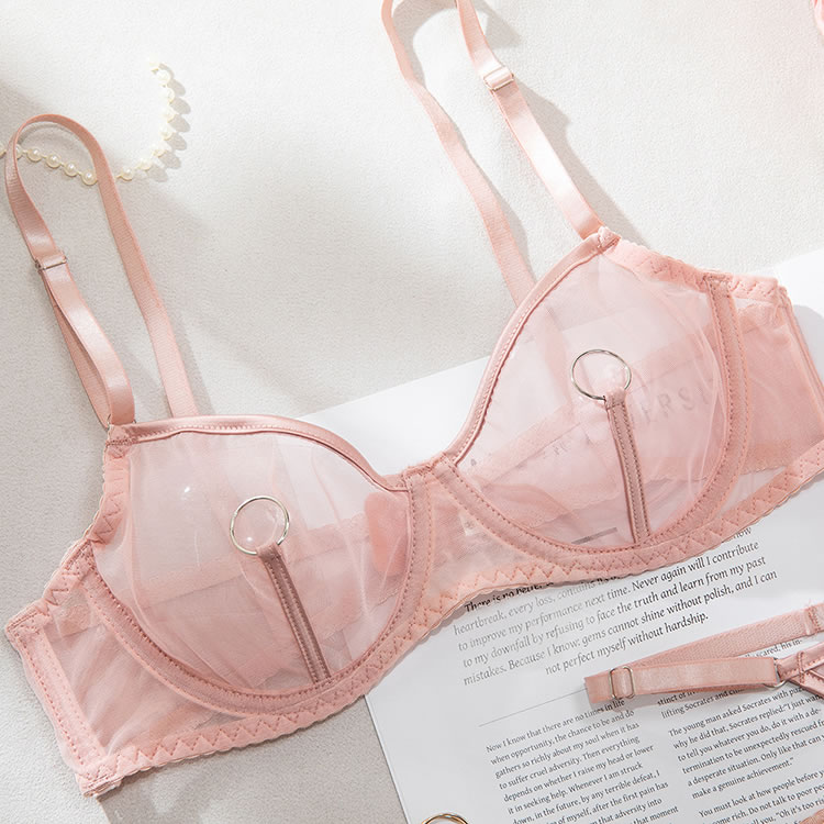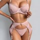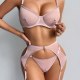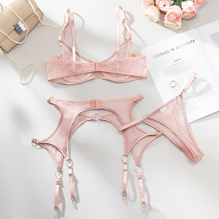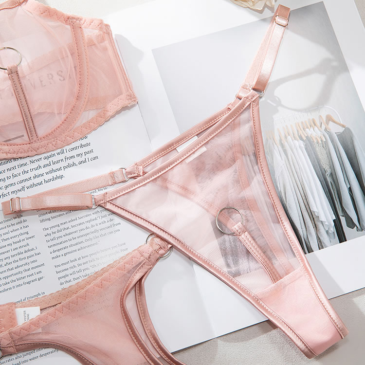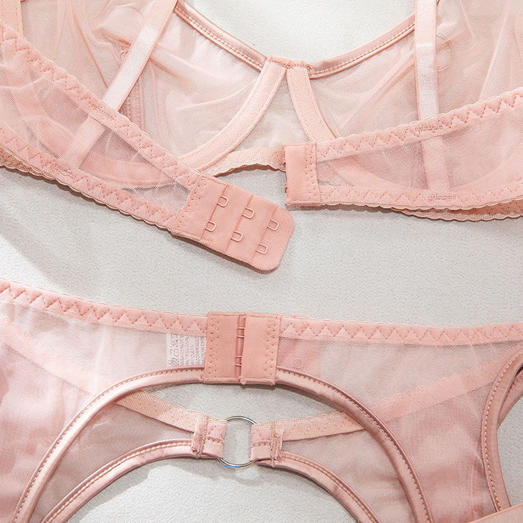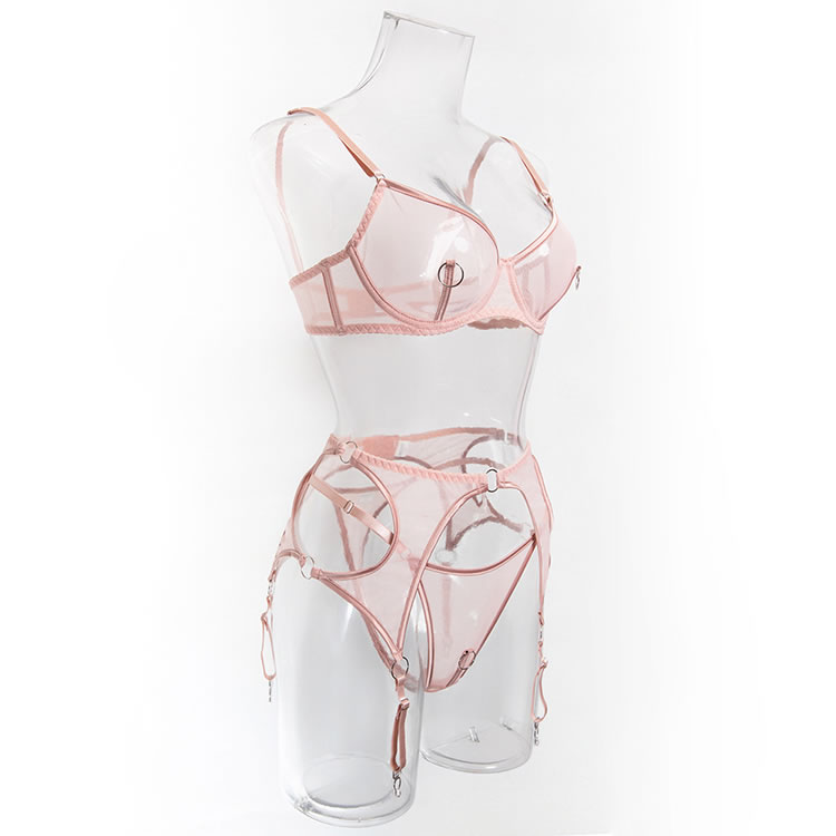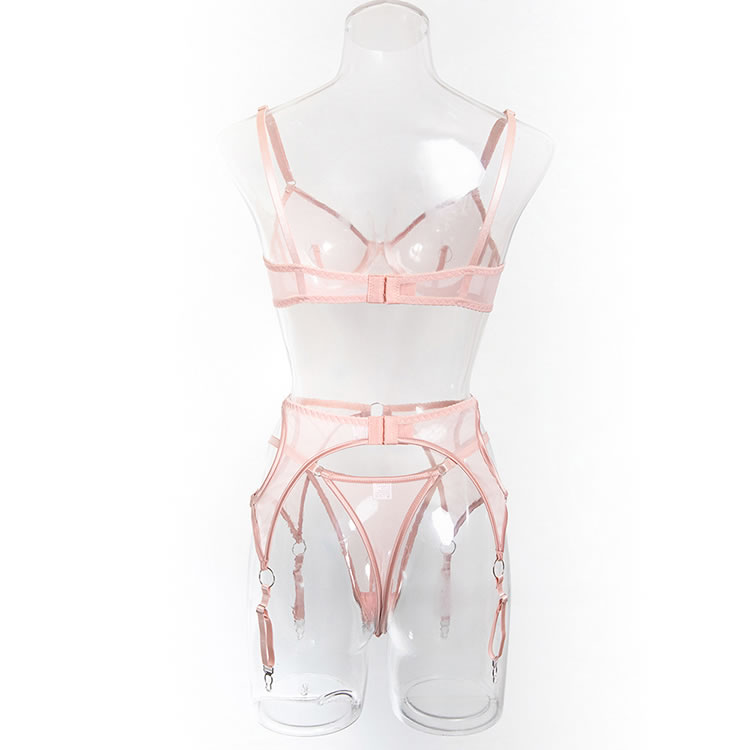 Make a powerful statement with this edgy pink lingerie ensemble that blends transparency with strong lines. The push-up bra offers support with a sleek mesh finish and circular hardware details, while the attached garter system wraps around the hips and thighs for a connected, sculpted look. The back is designed with thin straps and an open cutout, enhancing both shape and allure. Ideal for bold fashion choices or intimate moments with attitude.