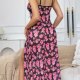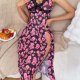 This romantic slip dress features a bold pink rose print over black mesh, accented with delicate lace trim along the sweetheart neckline. Adjustable spaghetti straps and a fitted bodice create a flattering shape, while the side slit adds subtle allure. Made from soft, breathable fabric that drapes beautifully — perfect for lounging or layering under robes. A charming blend of femininity and comfort.