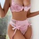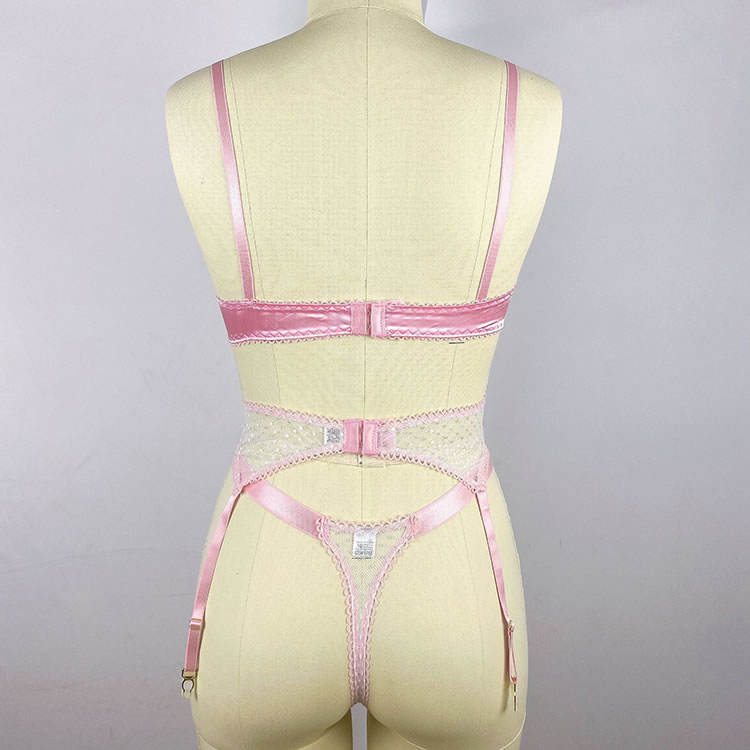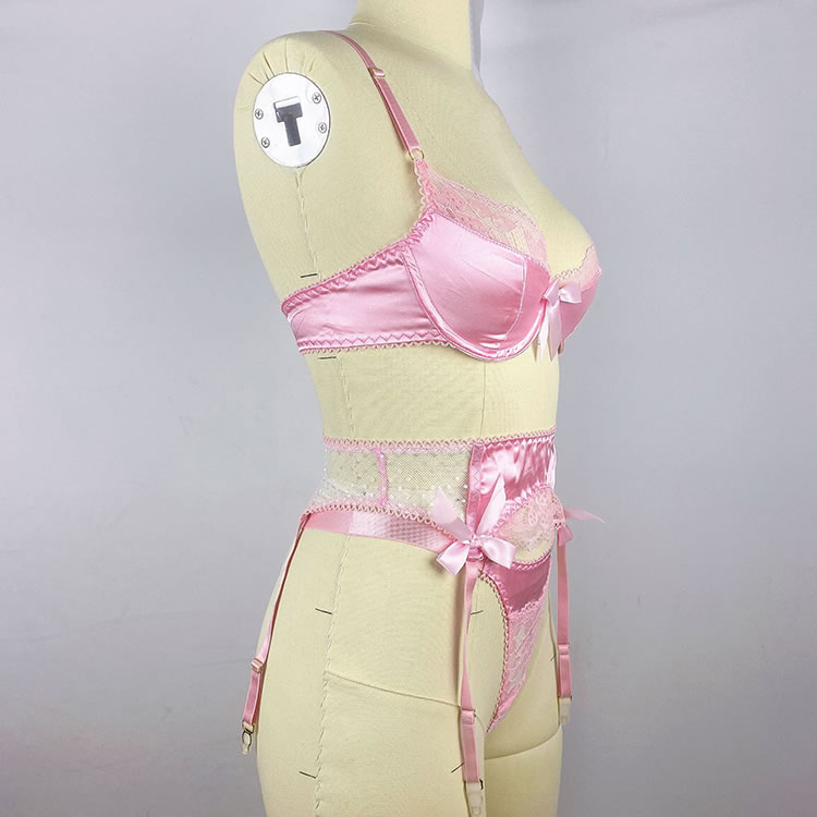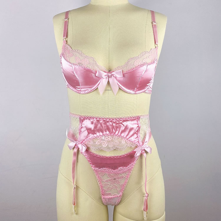 This charming pink lingerie set features a soft satin bra with delicate lace trim and a sweet bow at the center front, adding a playful touch. The matching high-cut panties are crafted with sheer mesh panels and scalloped lace edges, complemented by side bows that tie into elegant ribbons. Designed with thin adjustable straps and a secure back clasp, this set offers both comfort and flair. Perfect for romantic moments or special occasions, it combines feminine charm with bold silhouettes.