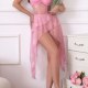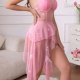 This pink lingerie set features a delicate blend of soft fabric and sparkling details for a sweet yet daring look. The top includes a structured bra with thin spaghetti straps and a sheer mesh panel at the center, creating a flattering silhouette. The skirt is made from flowing sheer material with a high-low hem that drapes elegantly, adding movement and drama. Tiny glitter accents are scattered across the fabric, catching the light with every step. Designed to highlight curves, this lingerie offers a romantic and bold vibe—perfect for those who love to mix innocence with confidence.