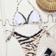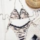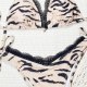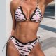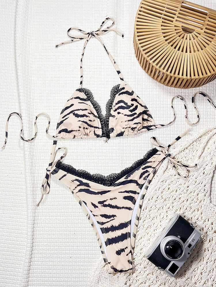 Show off your wild side with this pink and black tiger stripe bikini. The triangle top and matching bottoms are accented with delicate black lace trim along the edges, adding a feminine touch to the bold print. Both pieces feature adjustable tie straps at the neck, back, and hips, allowing you to customize the fit for maximum comfort and support.