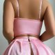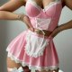 This sweet and playful pink maid-inspired lingerie set brings a touch of charm with its soft and delicate details. The cropped top features thin adjustable straps, a supportive bustier design, and a front lace-up panel with white ribbon for a customizable fit. Paired with a flirty mini skirt trimmed in lace, it includes a matching apron-style accent that adds a classic touch. Thigh-high garters with bow ties complete the look, making it perfect for themed nights or romantic evenings.
