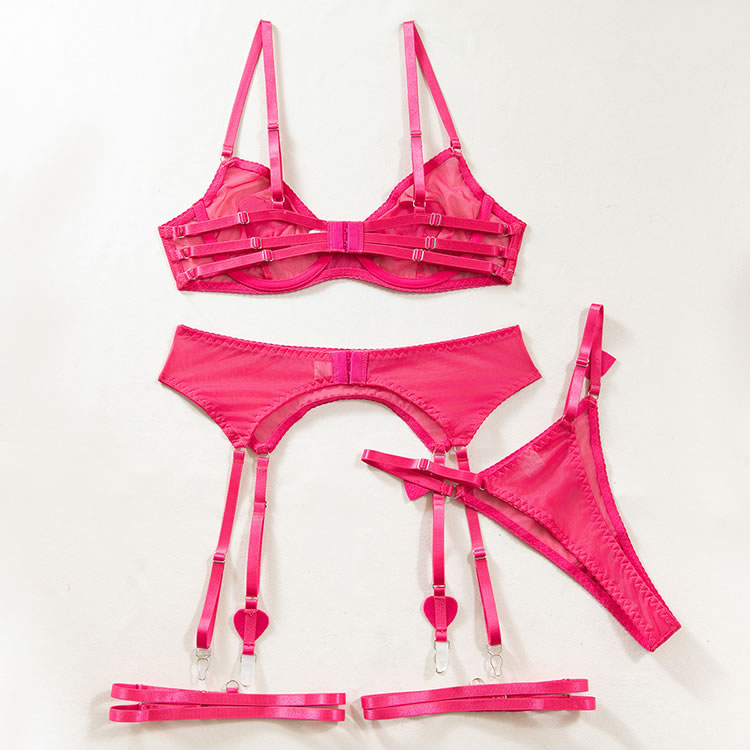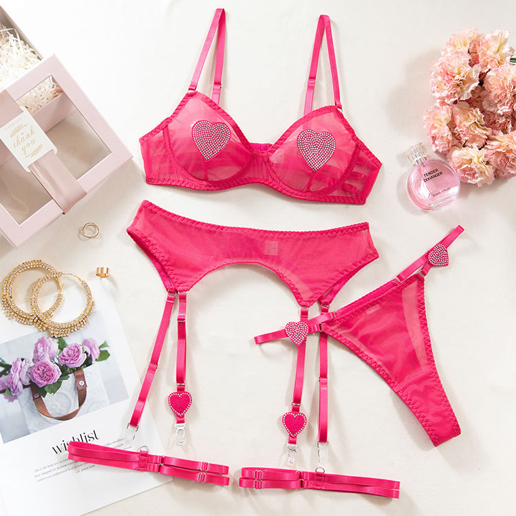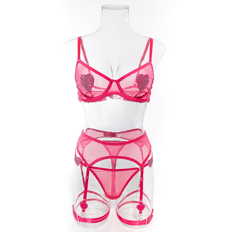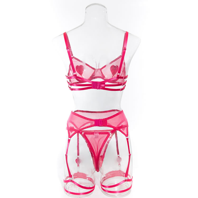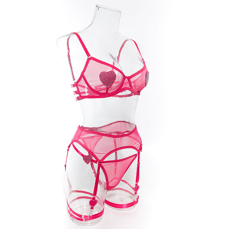 Embrace a playful and vibrant look with this pink heart lingerie set. The sheer fabric is adorned with sparkling heart embellishments that add a touch of whimsy and charm. The bra features delicate mesh trim and supportive design, while the matching garter belt and panties offer both style and comfort. Perfect for those who want to feel confident and fun.