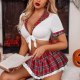 Step into the classroom with this playful schoolgirl-inspired lingerie set, perfect for themed parties or fun role-play. The outfit features a cropped white top with a front tie detail and red plaid trim on the collar and sleeves, paired with a flirty red plaid mini skirt that has a delicate lace hem. Designed to make a bold statement, this ensemble brings a cheeky twist to a classic look—ideal for Halloween, costume events, or intimate moments.