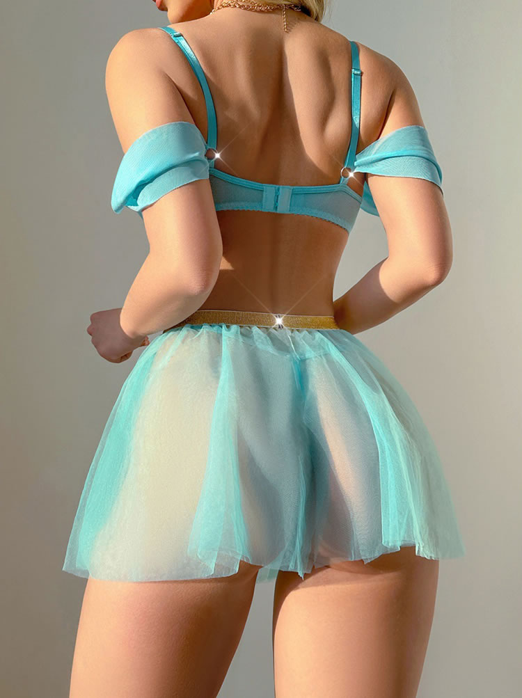 Step into fantasy with this dreamy lingerie set that brings a touch of magic to your nightwear. The turquoise bra features delicate gold trim and a sweet bow at the center, while the off-the-shoulder straps add a flirty flair. Paired with a soft, layered tulle skirt and a shimmering chain accent, it’s perfect for adding sparkle to romantic evenings or themed nights.