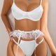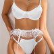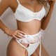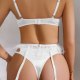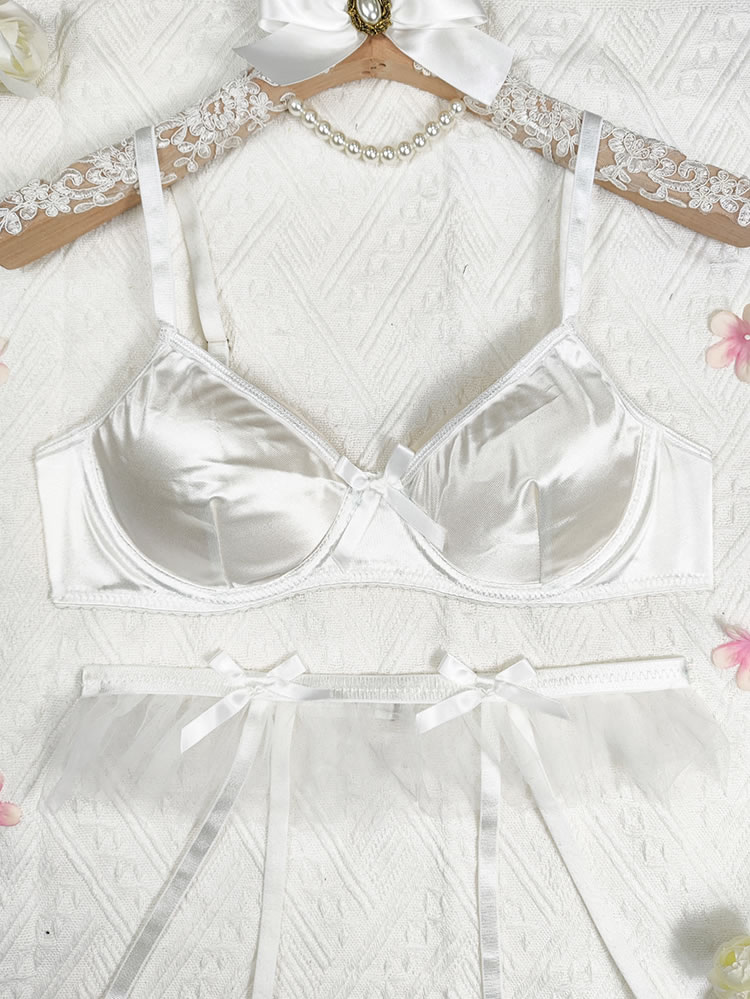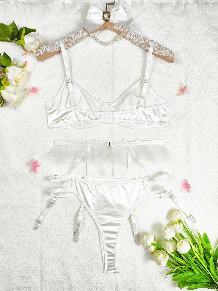 This bold lingerie set combines smooth satin fabric with delicate sheer mesh accents for a modern and daring look. The underwire bra features a deep V-neckline and a central bow detail that adds a touch of romance. Paired with a high-cut garter that includes a layered tulle trim and adjustable garter straps, it creates a cohesive and edgy silhouette. Designed to highlight curves, it’s ideal for intimate evenings or themed occasions.