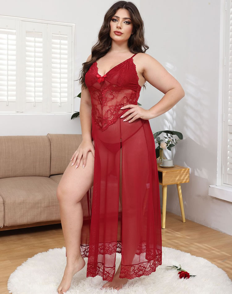 This exquisite lingerie set features a stunning red design with intricate lace detailing and sheer mesh fabric. The sweetheart neckline enhances the décolletage beautifully, while the strappy accents add a touch of allure and sophistication. The fitted design accentuates the figure, creating a flattering and elegant silhouette. The adjustable straps and high slit ensure a comfortable and customizable fit, making it perfect for both intimate moments and stylish boudoir photoshoots.