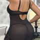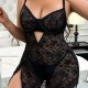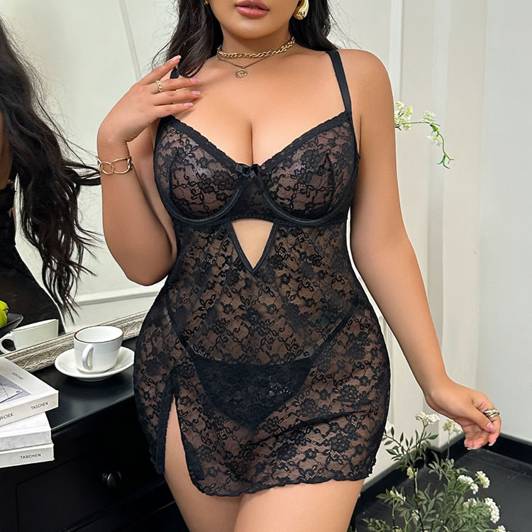 This bold plus-size lace body suit combines sultry design with flattering details that highlight your shape. Featuring a deep V-neckline with a central cutout, it offers a daring yet elegant silhouette. The intricate black lace pattern runs throughout the bodice and flares into a soft, scalloped hem, while sheer mesh panels enhance the sleek look. Adjustable straps and a back clasp ensure a secure fit, and the oval-shaped back cutout adds a modern touch. With a side slit that adds movement and allure, this piece is perfect for intimate evenings or as a statement addition to your loungewear collection.