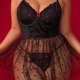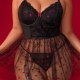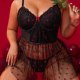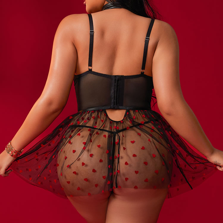 This eye-catching plus-size lingerie set blends romantic charm with daring design. The black lace bralette features red heart accents across the cups and a central bow detail, adding a sweet touch to its structured silhouette. A sheer mesh waistband transitions into a flirty tulle skirt adorned with scattered red hearts, creating a whimsical yet sultry look. The back showcases a clean, supportive design with an oval cutout that adds modern flair. Designed to celebrate full figures, this set is perfect for special occasions or making a statement in your own space.