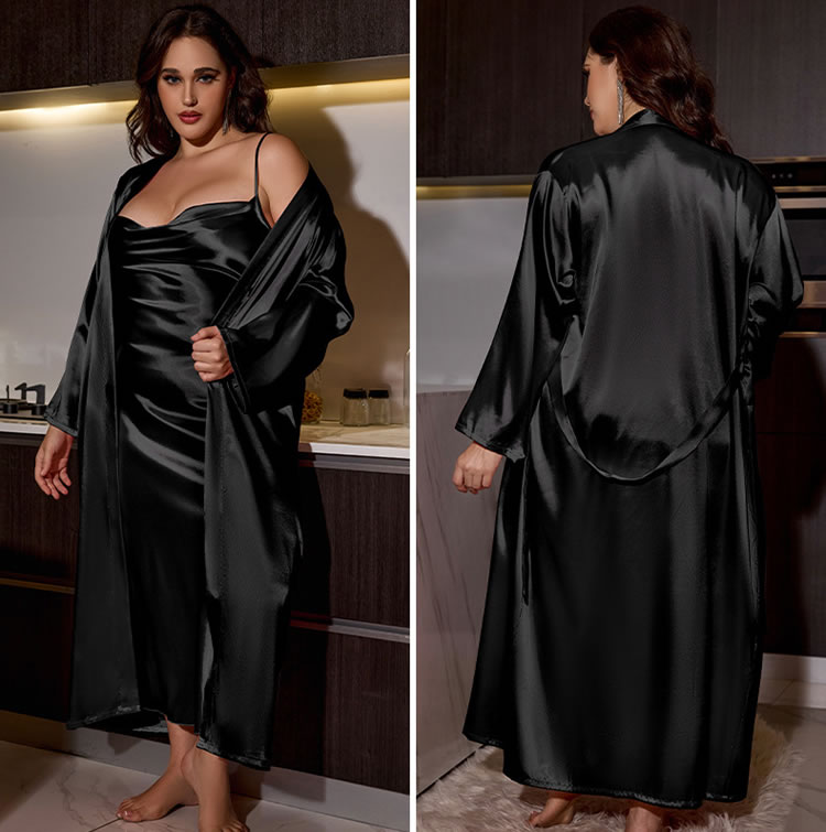 Elevate your intimate wardrobe with this seductive black satin robe and slip dress set. The robe is designed with a timeless silhouette, complete with a tie waist to accentuate your figure. The slip dress underneath is made from the same high-quality satin, providing a seamless and elegant feel. This set is ideal for both everyday comfort and romantic evenings.