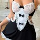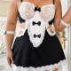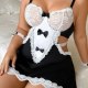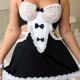 Step into roleplay ready mode with this cheeky black-and-white maid-style babydoll designed for curves. The lace-trimmed bust features sheer floral mesh cups and three tiny black bows down the front for a touch of mischief. Cutouts at the waist add allure, while the flared skirt ends in scalloped lace for a sweet-but-sexy finish. Includes matching choker, wrist cuffs, and a satin tie-back that lets you adjust the fit from behind. Soft stretch fabric moves with you — perfect for themed nights, confidence boosts, or just feeling like the boss of your own boudoir.