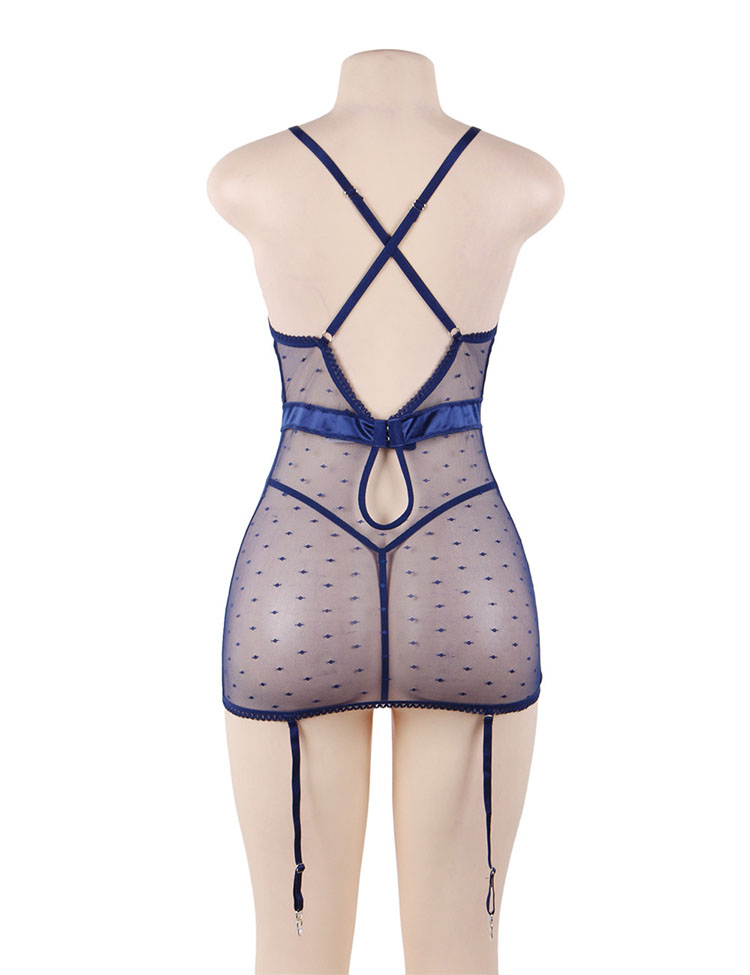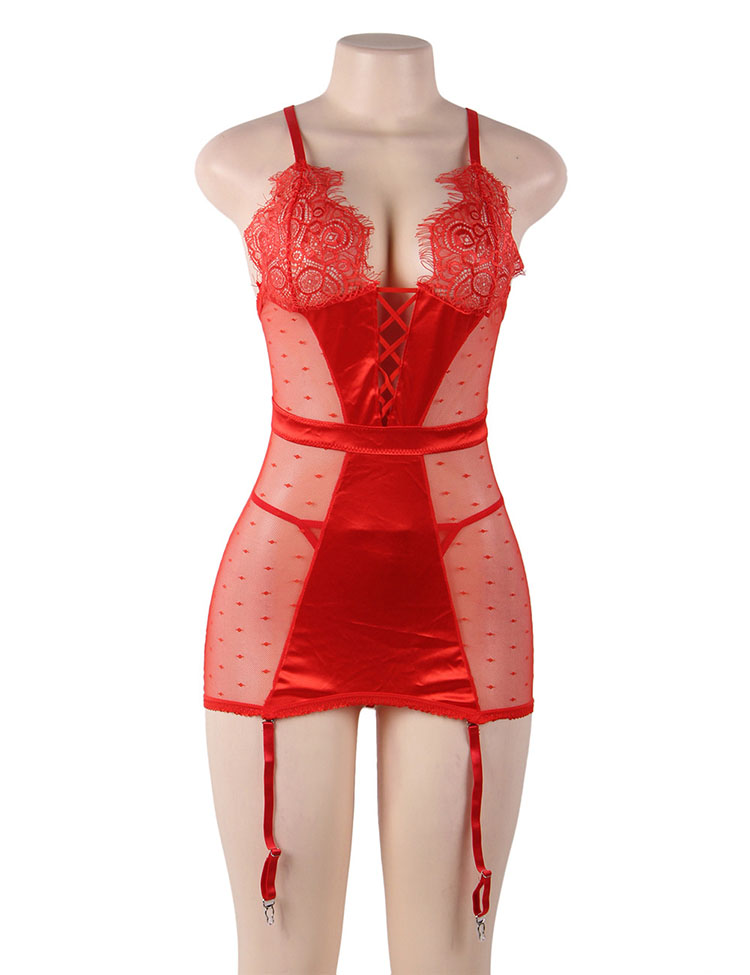 Tantalize your babe with pleasure in this sexy plus size chemise set featuring sheer lace cups with an eyelash trim, adjustable criss-cross spaghetti straps, a hook and eye back closure with a keyhole, a satin and sheer mesh bodice with dotted detailing, adjustable garter straps, and a matching thong.