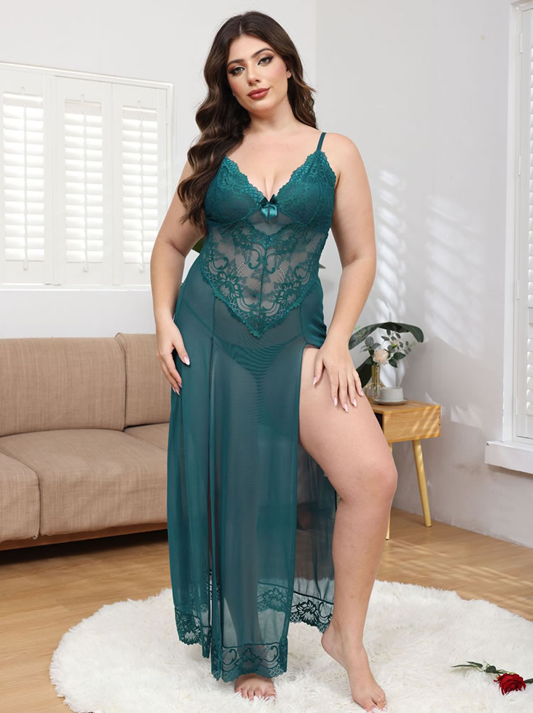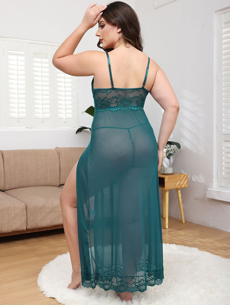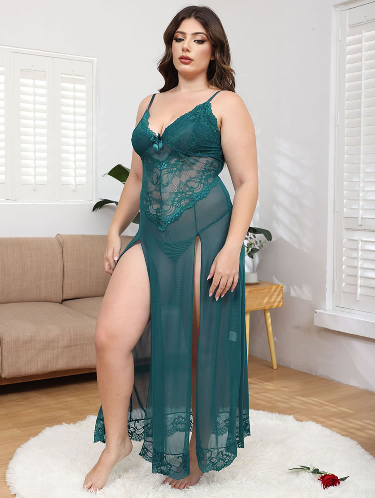 This exquisite lingerie set features a stunning teal design with intricate lace detailing and sheer mesh fabric. The sweetheart neckline enhances the décolletage beautifully, while the strappy accents add a touch of allure and sophistication. The fitted design accentuates the figure, creating a flattering and elegant silhouette. The adjustable straps and high slit ensure a comfortable and customizable fit, making it perfect for both intimate moments and stylish boudoir photoshoots.