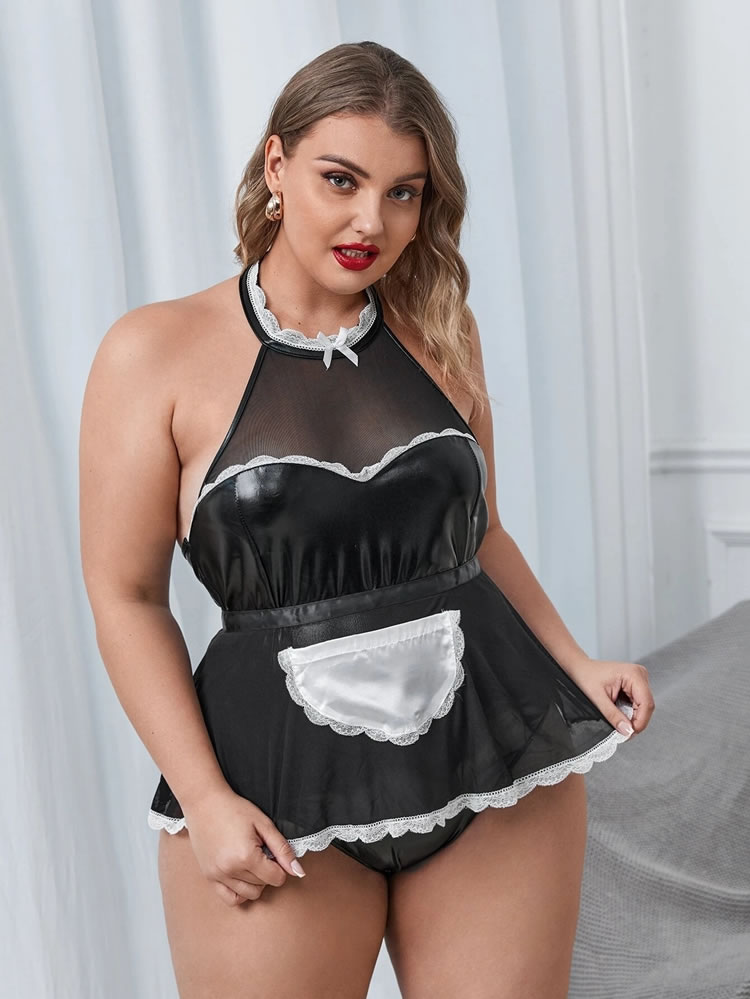 Get down and dirty in this plus size Hot Mess French Maid lingerie costume featuring a high neckline, a black leatherette bodice, a cheeky cut back, and a matching sheer apron with a tie back closure.
