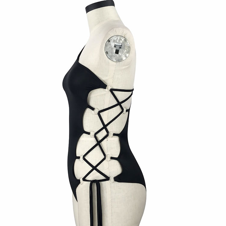 Show off your tan in this exclusive plus size swimsuit featuring soft cups with removable padding, a one shoulder style, an open side panel with lace-up detailing, and a cheeky cut back.