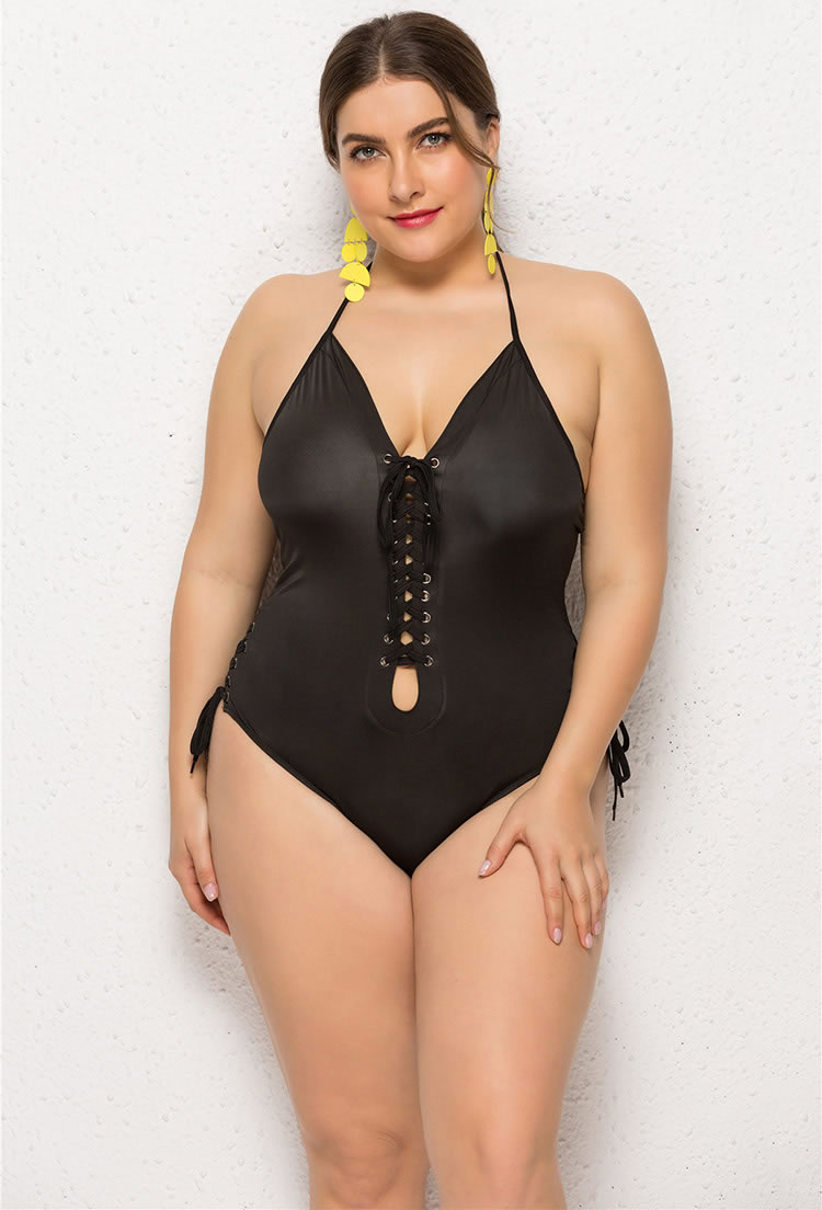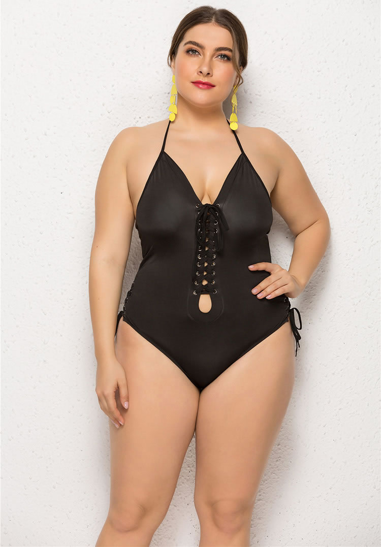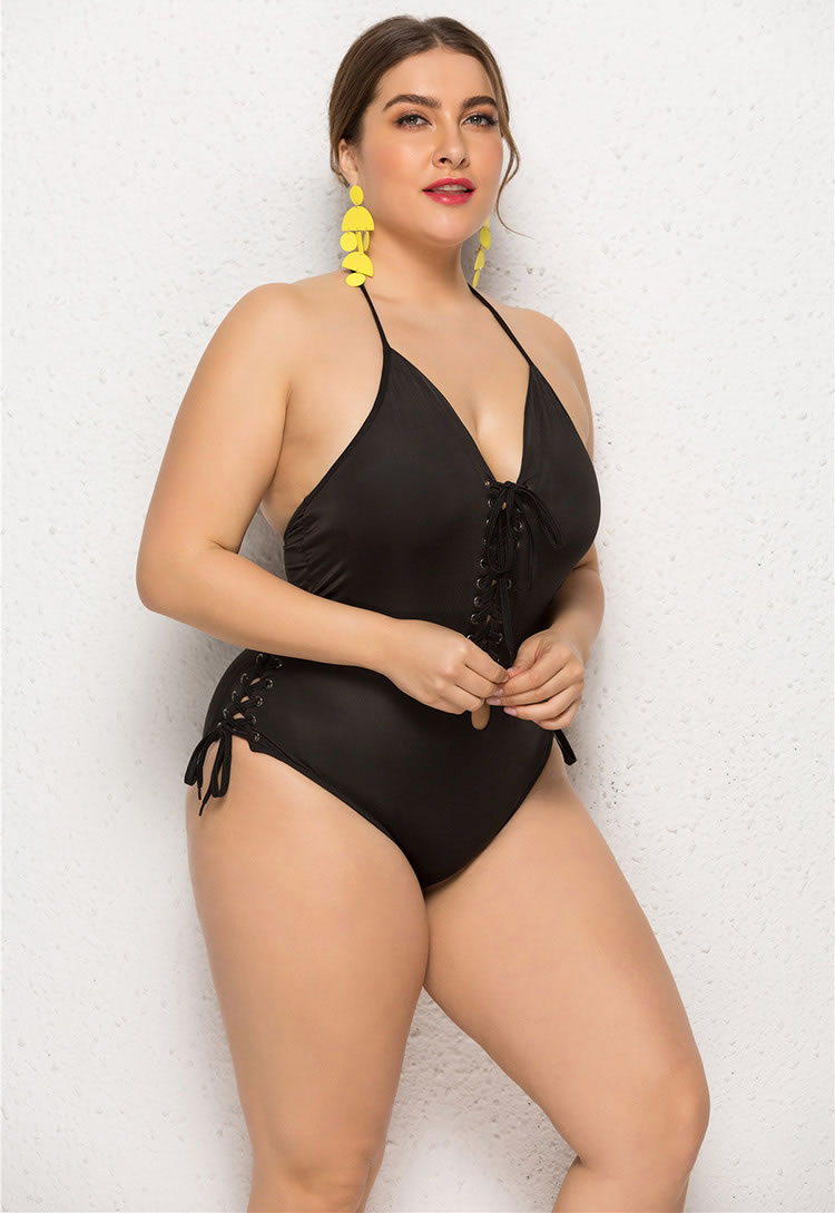 Feel the sand between your toes in this exclusive plus size black one piece swimsuit featuring soft cups with removable padding, a plunging neckline with lace-up detailing, halter straps, lace-up sides, and a cheeky cut back.