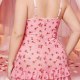 Embrace a romantic and feminine aesthetic with this plus-size floral chemise. The soft pink fabric features a charming red rose print, creating a sweet and inviting look. Designed with a sweetheart neckline, it includes a delicate satin bow at the center. The dress features ruched detailing down the front, offering a figure-flattering fit that accentuates curves, while the double-layered ruffle hem adds a playful, flirty touch. Adjustable satin straps ensure a comfortable and personalized fit for a restful night's sleep or a special evening.