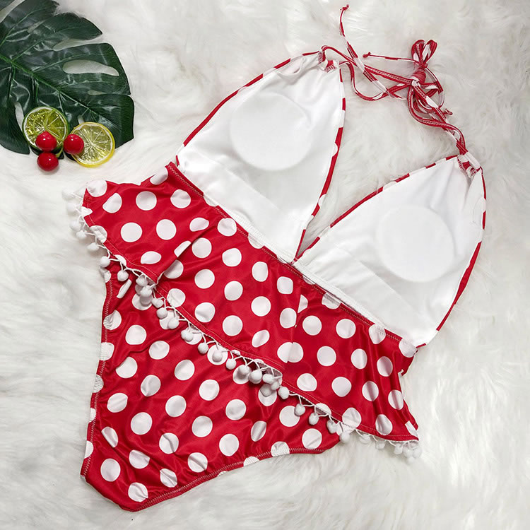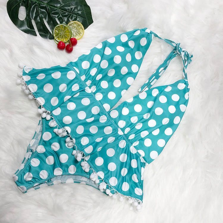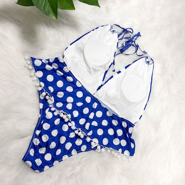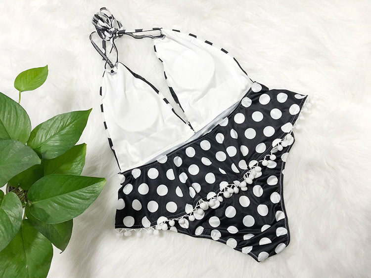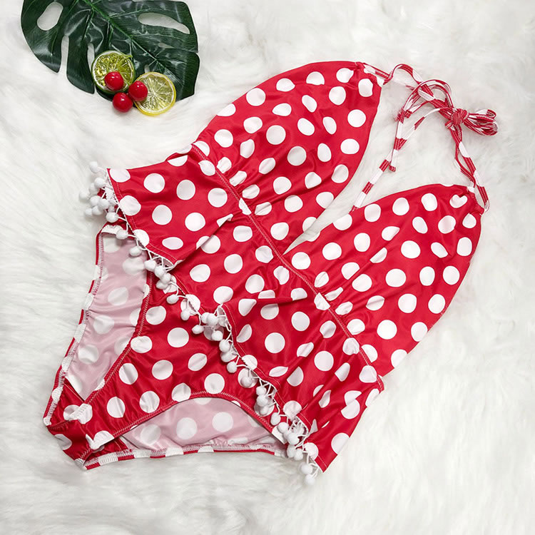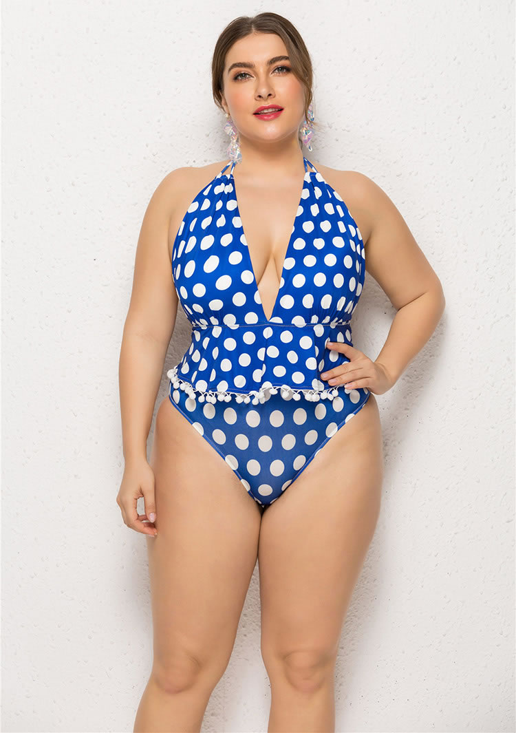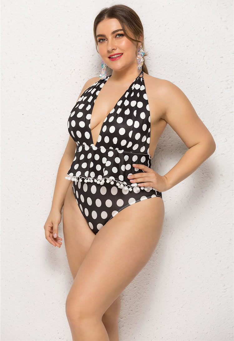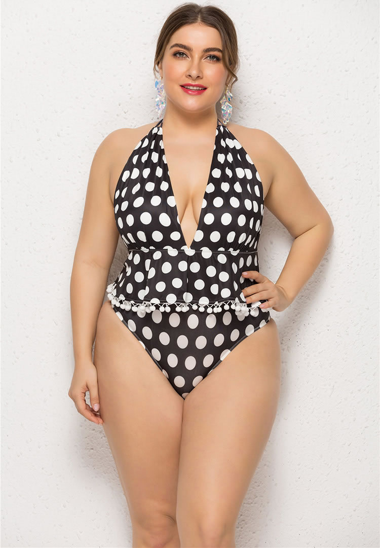 Lounge poolside in this gorgeous, plus size, one piece swimsuit featuring soft cups with removable padding, a low-cut V-neckline, halter straps, an allover white polka dot design, a ruffled waistband with a white pom pom trim, and a cheeky cut back.