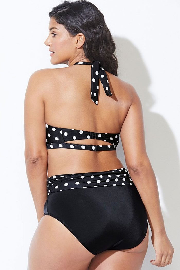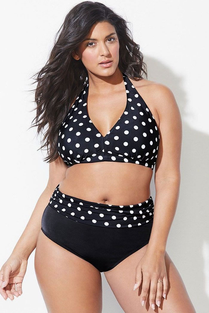 A polka dots printed makes this supportive two piece bathing suits a retro style. This plus size swimwear is made out of nylon and spandex, the bikini top with cups padding, v neck with halter tied, double straps with slid closure back, to complete this bikini set with a matching high waist bikini bottom with ruched dots printed waistband and full coverage back.