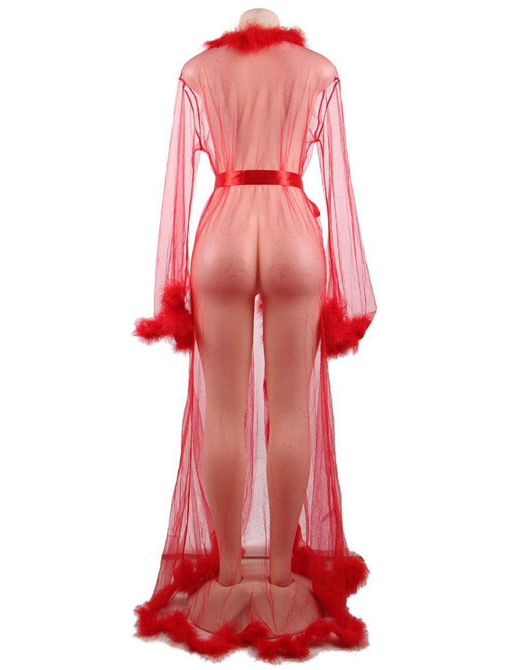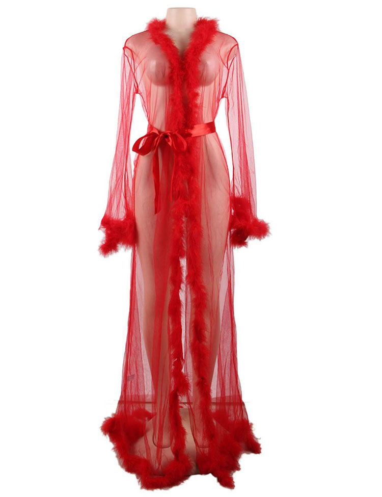 【Sexy Robe】-- Sheer robes featuring long sleeve, oblique v-neck, satin belt, faux fur trim at the sleeves or lower hem, show your body perfectly, make you looks more elegant.
