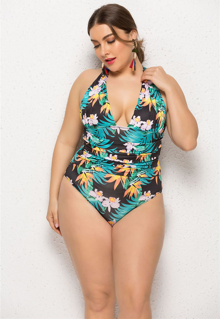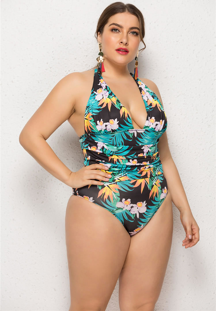 Show off your sporty side in this rainforest print swimsuit featuring soft cups with removable padding, a low-cut V-neckline, thick shoulder straps, and a cheeky cut back.