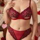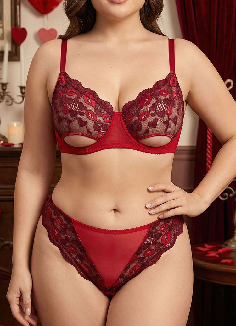 Ignite the romance with this bold red plus-size lingerie set. This two-piece features a sheer floral lace bra with a deep plunge neckline and supportive underwire cups that lift and shape your curves. The matching sheer panties offer a cheeky cut with similar lace detailing and a red mesh center panel for coverage. Designed with comfort and confidence in mind, this set is perfect for special occasions or adding a spark to your daily routine.