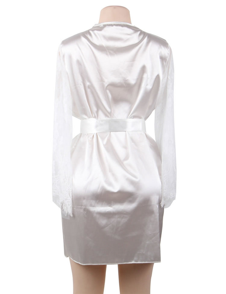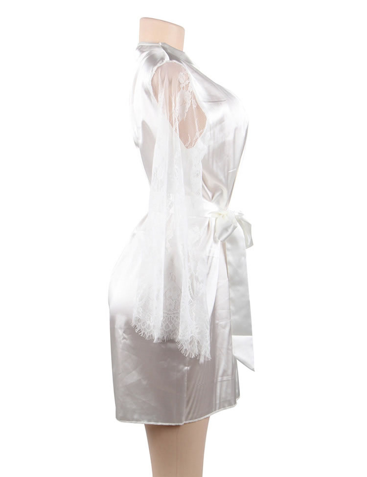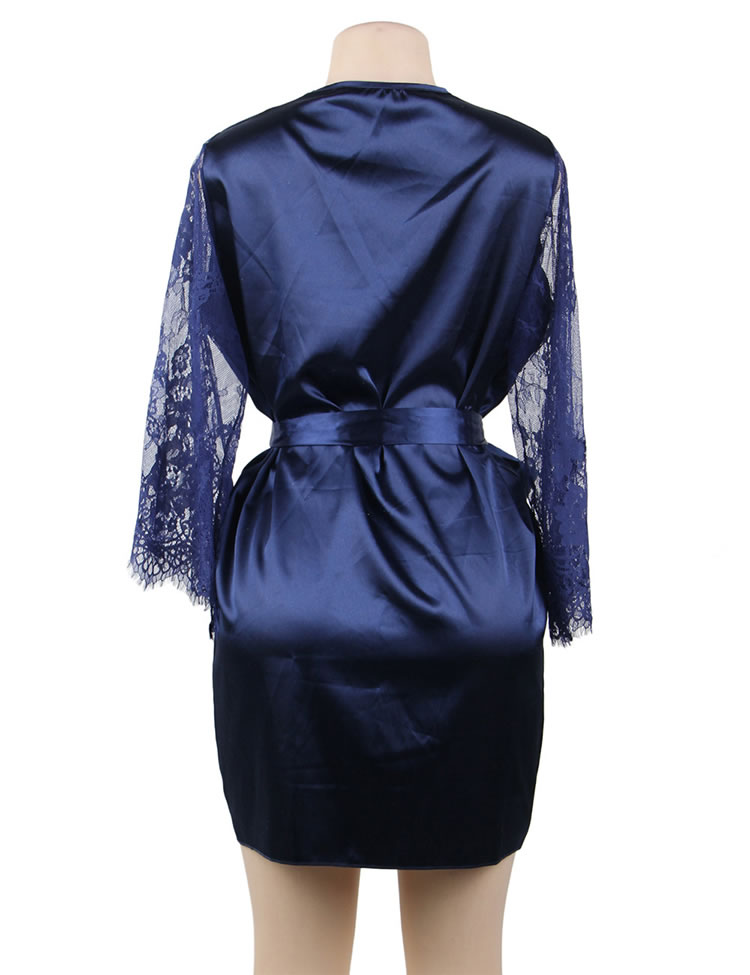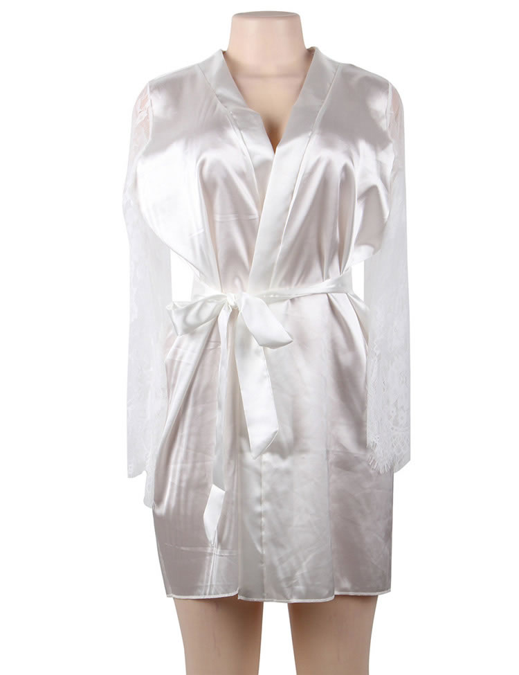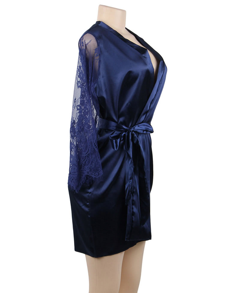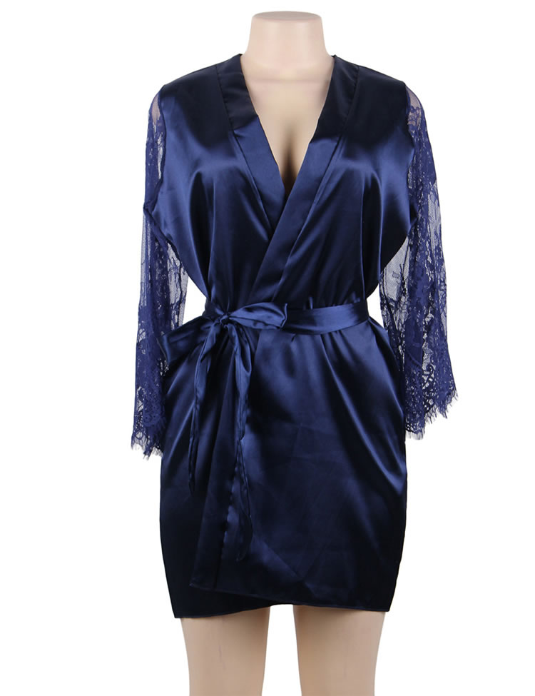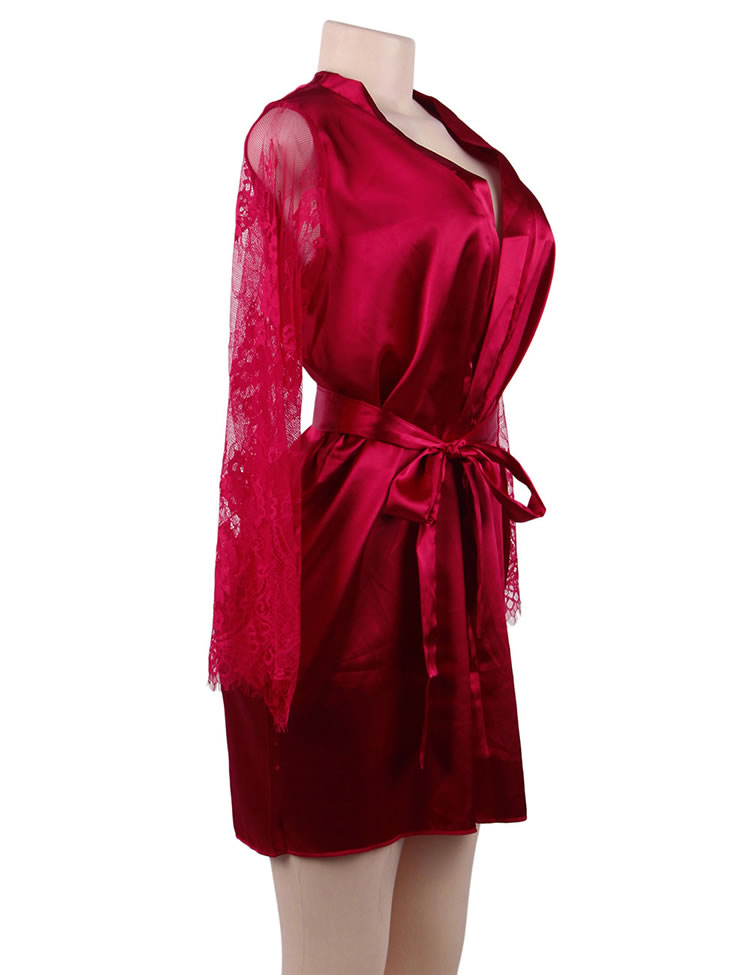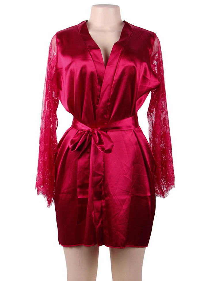 Look elegant while being comfortable in this plus size satin robe featuring an all over satin with lace long sleeves, a thin satin waist belt with a tie front closure.