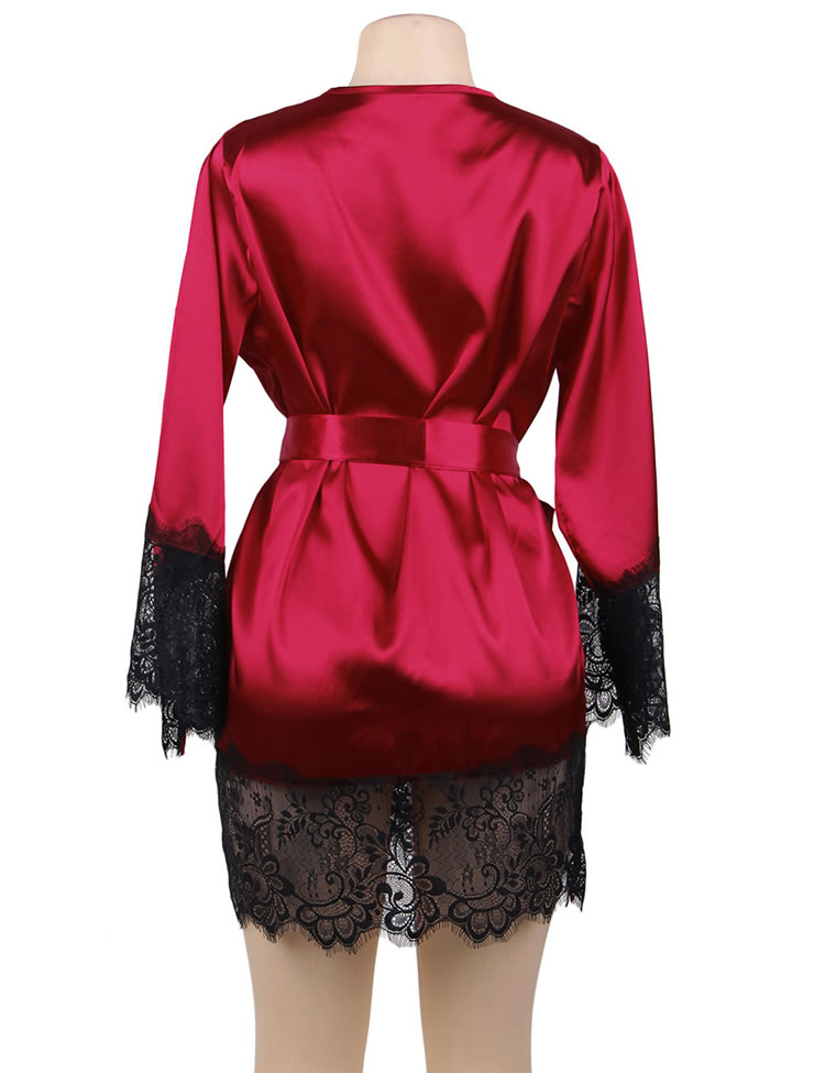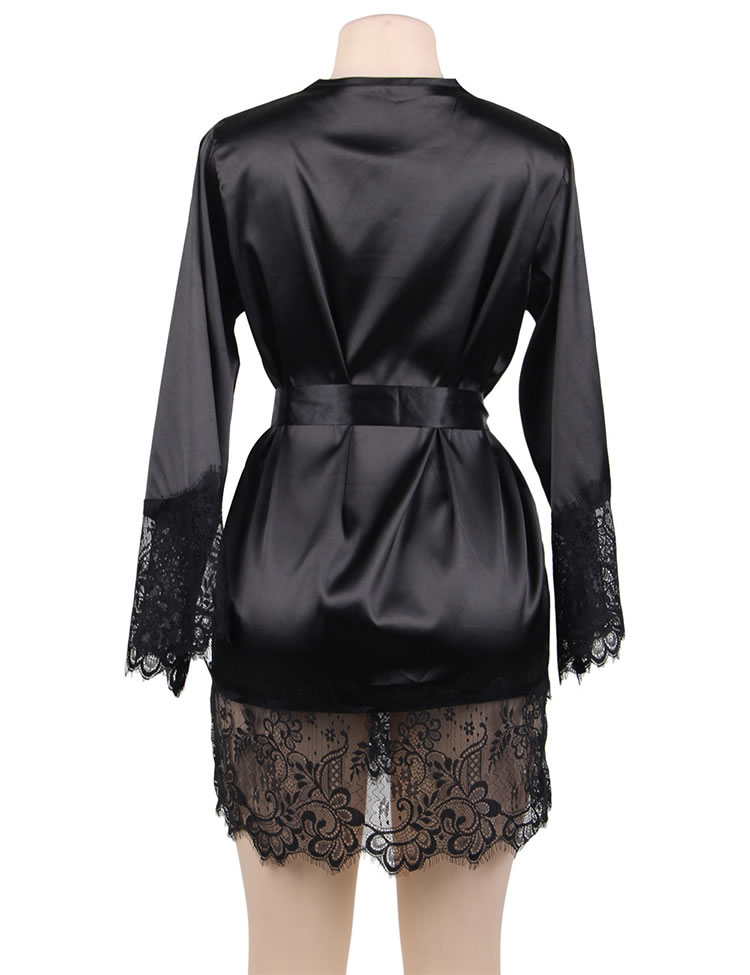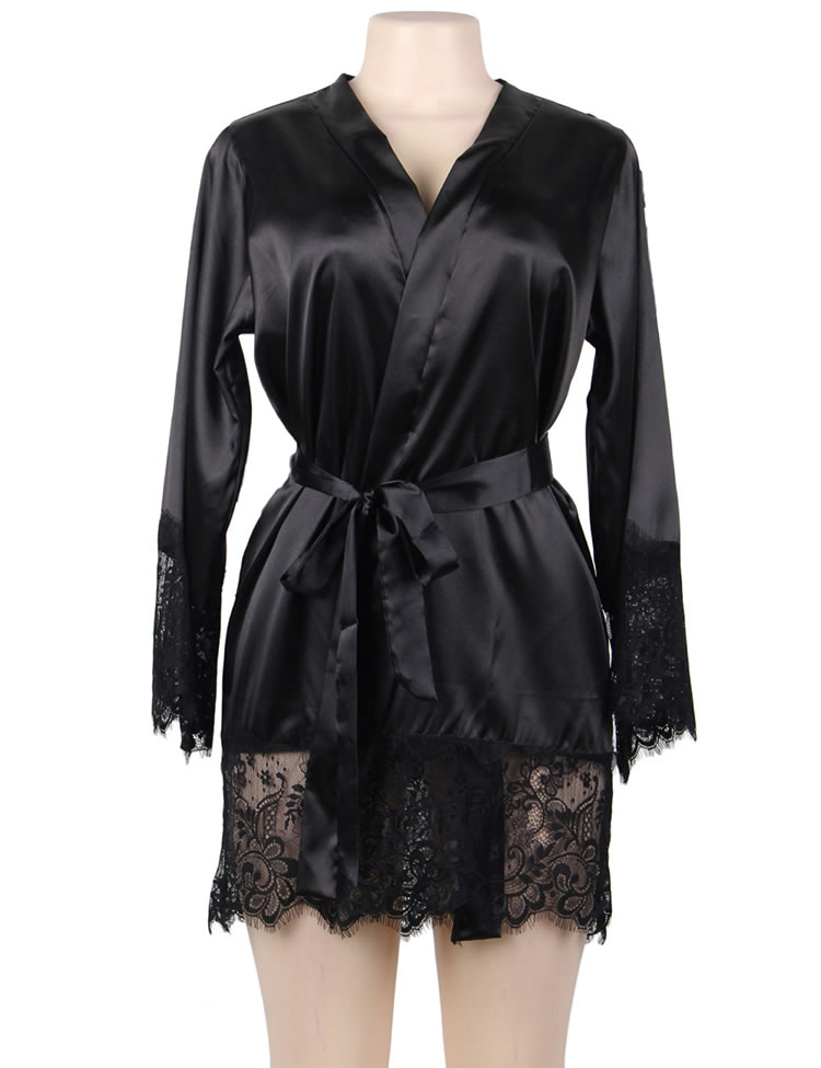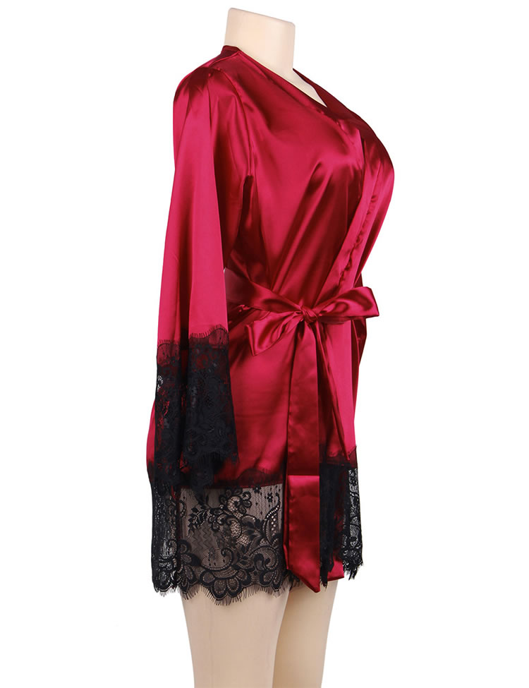 Charm your cutie in this sexy plus size robe featuring an all over satin, an open front, a thick lace hem, a satin waist belt with a tie closure, long sleeves, and sheer lace cuffs.