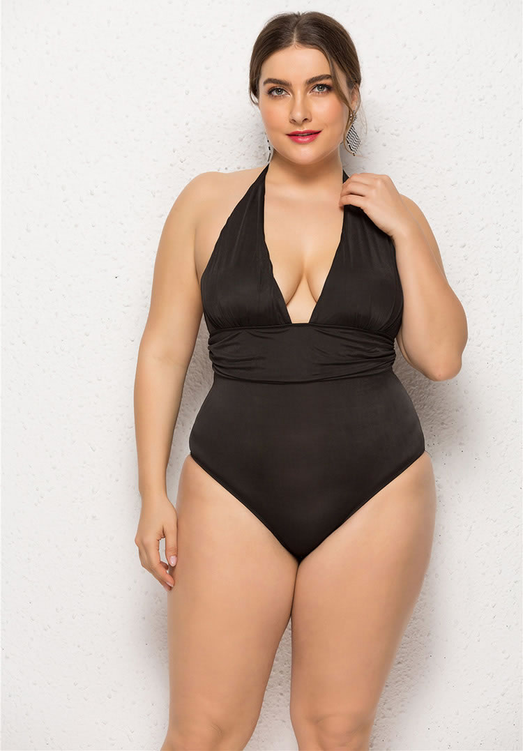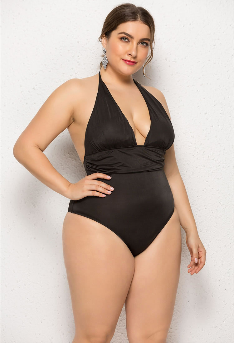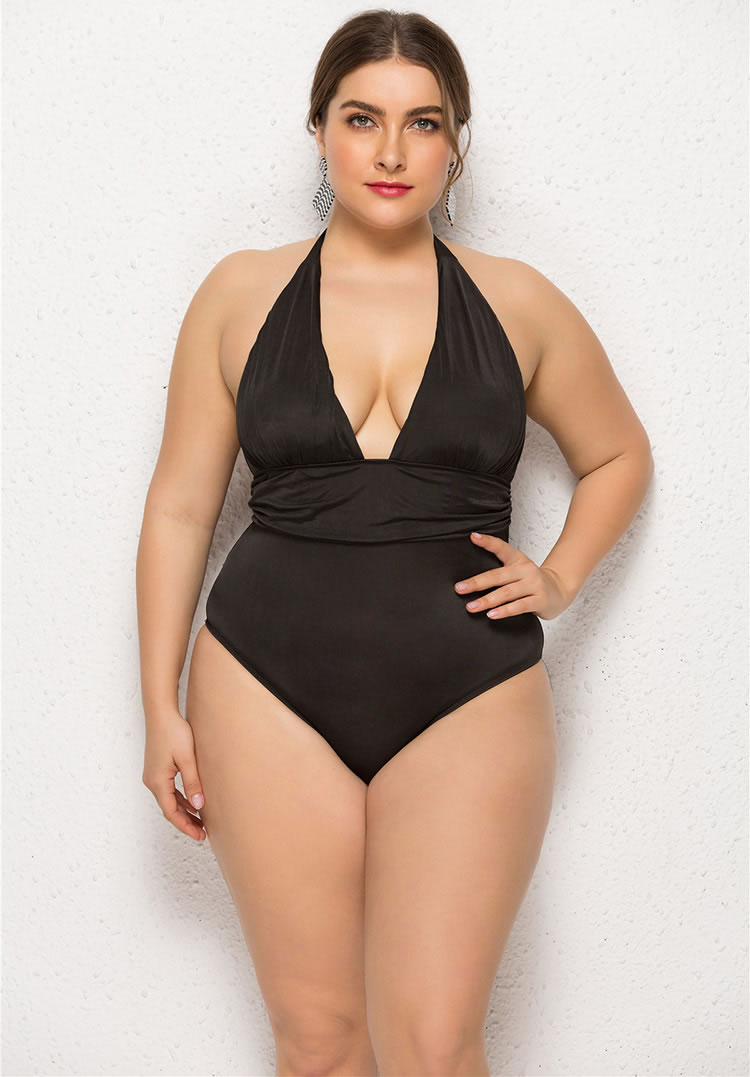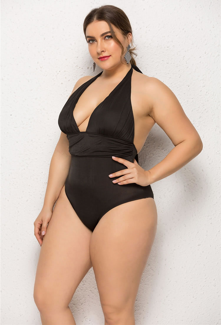 Lounge by the pool in this exclusive plus size swimsuit featuring soft cups with removable padding, a low-cut V-neckline, a black underbust band, an open back, and a cheeky cut back.