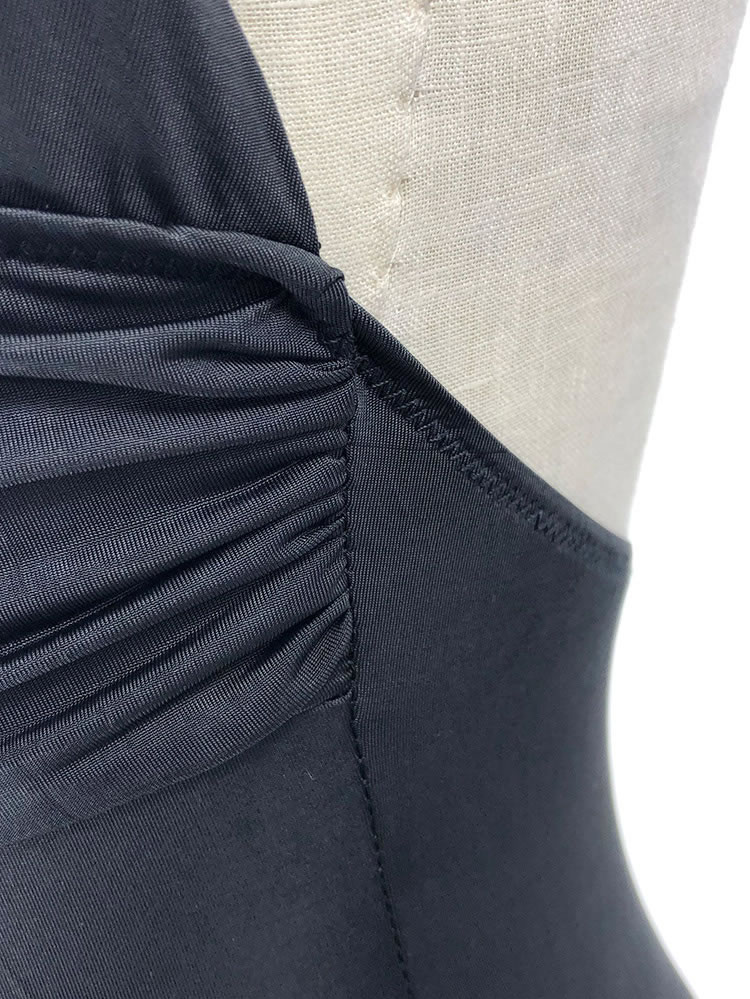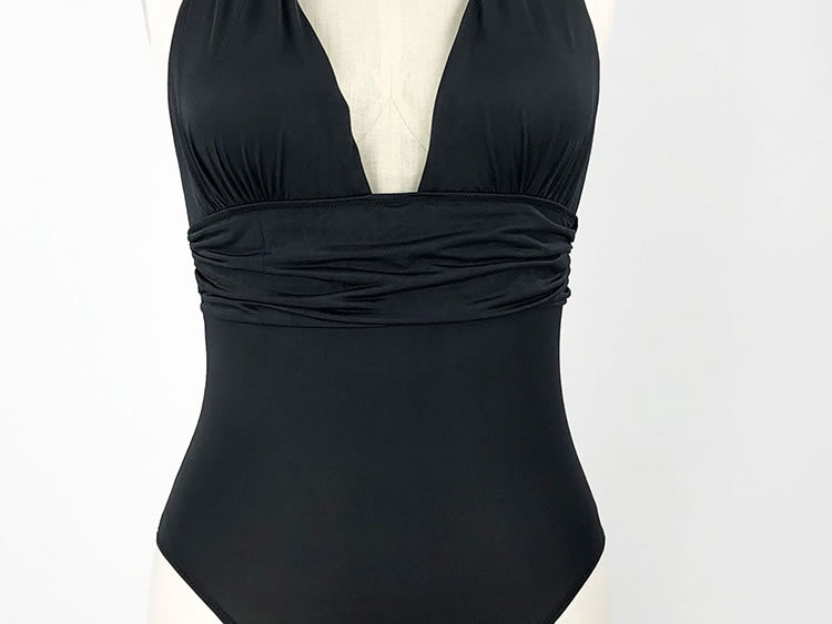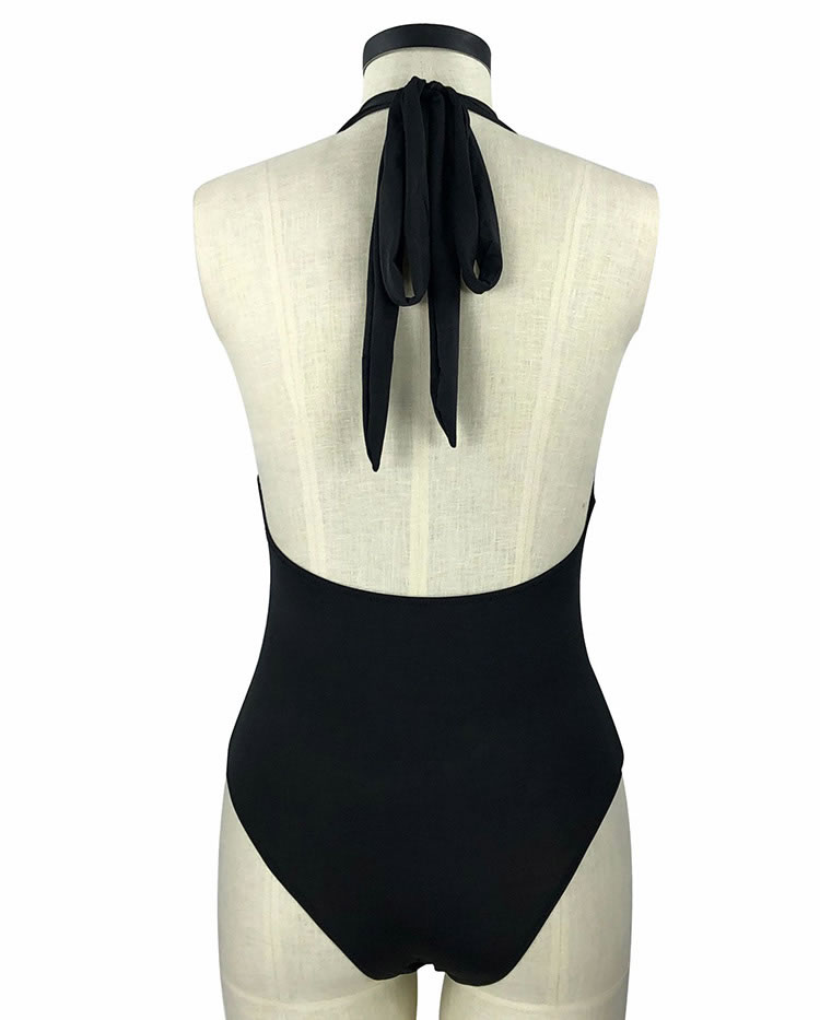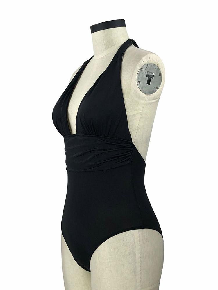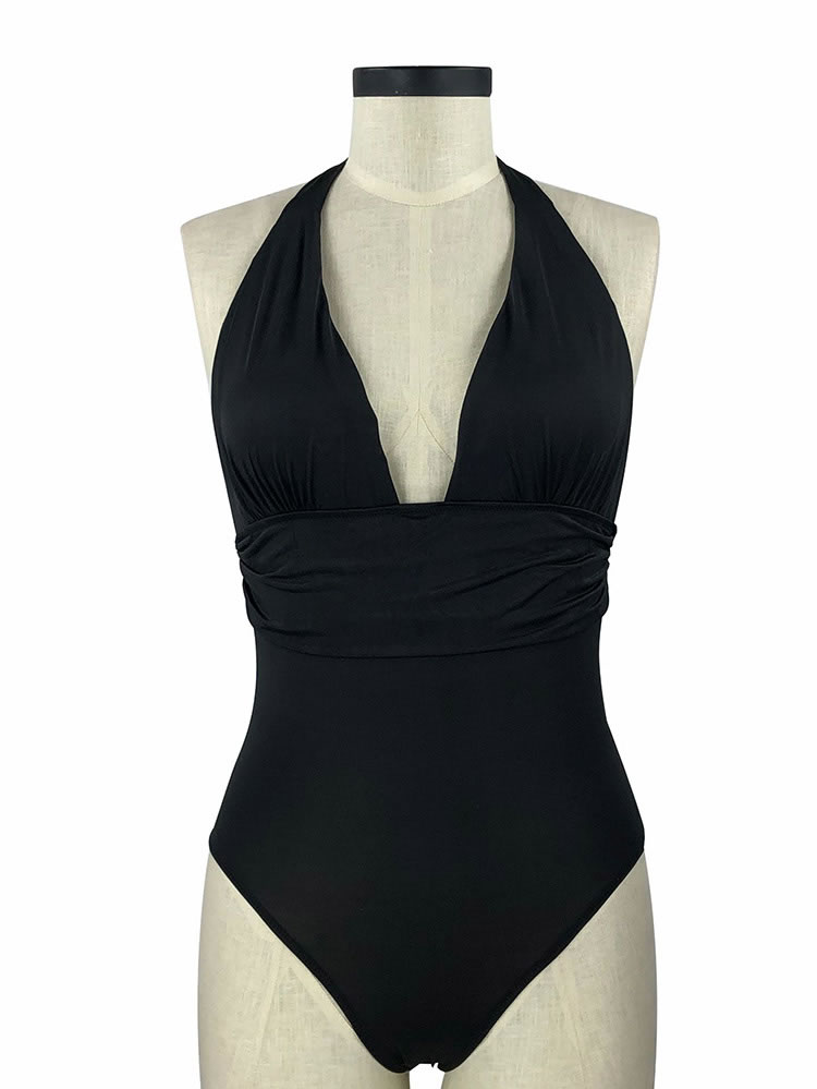 Lounge by the pool in this exclusive plus size swimsuit featuring soft cups with removable padding, a low-cut V-neckline, a black underbust band, an open back, and a cheeky cut back.