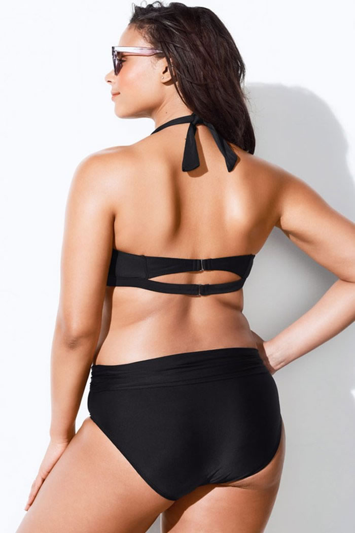 Level up your swim style from beach to workout in this two piece bathing suits. This plus size swimwear is made out of nylon and spandex, the bikini top with cups padding, v neck with halter tied, double straps with slid closure back, to complete this bikini set with a matching high waist bikini bottom with ruched waistband and full coverage back.