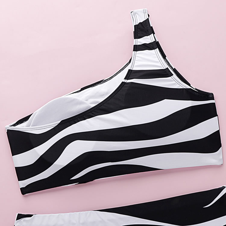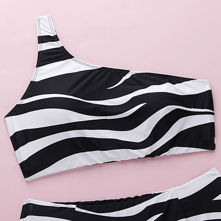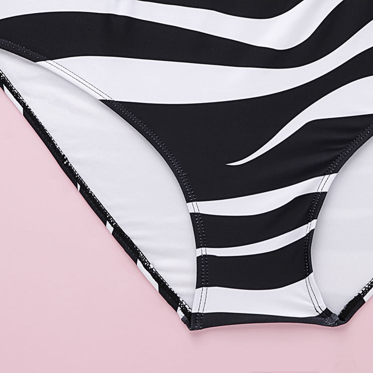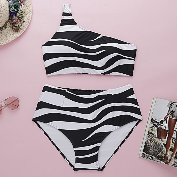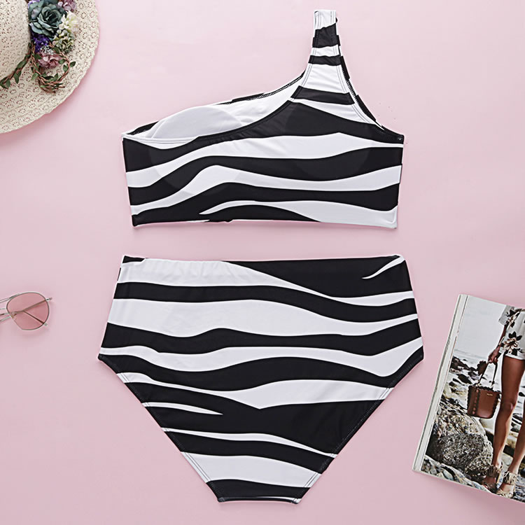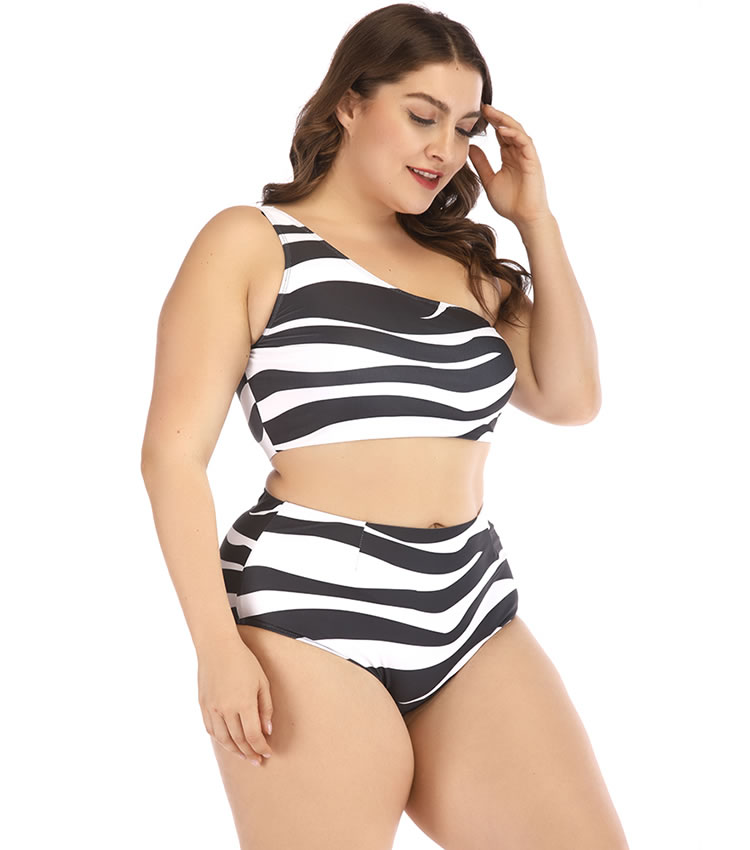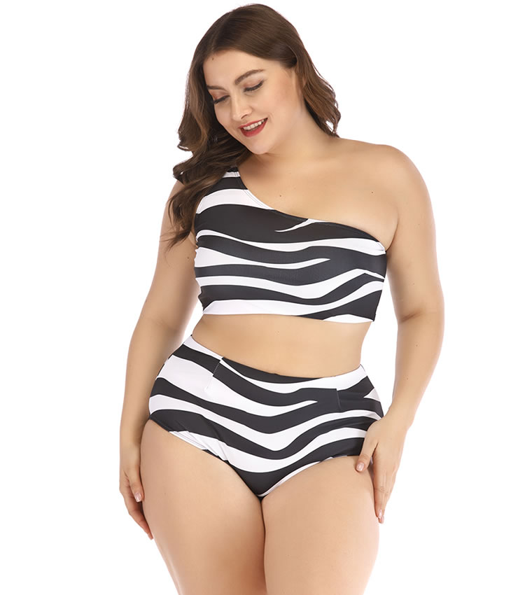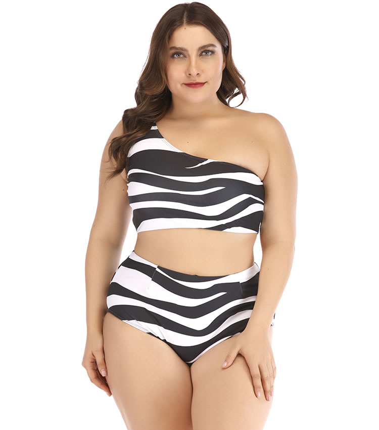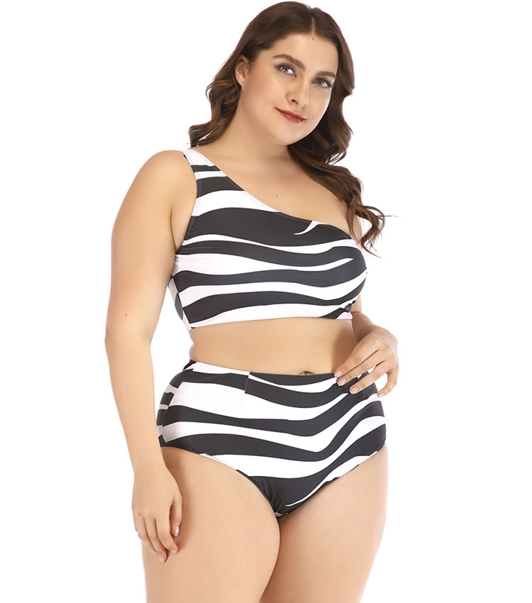 Lounge by the pool in this exclusive plus size swimwear featuring an allover zebra print, a one shoulder style, a matching bottom with high waist and a cheeky cut back.