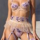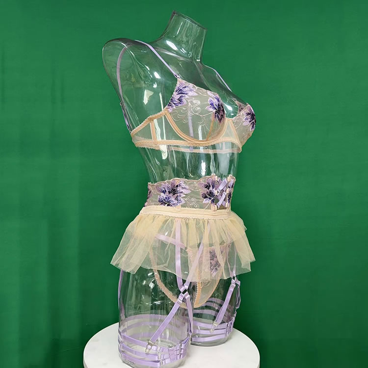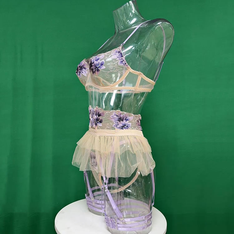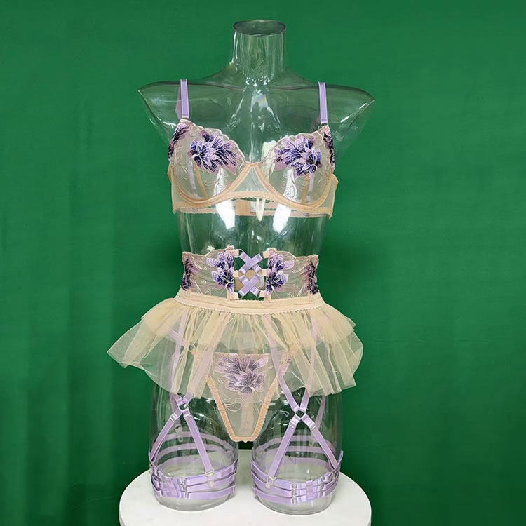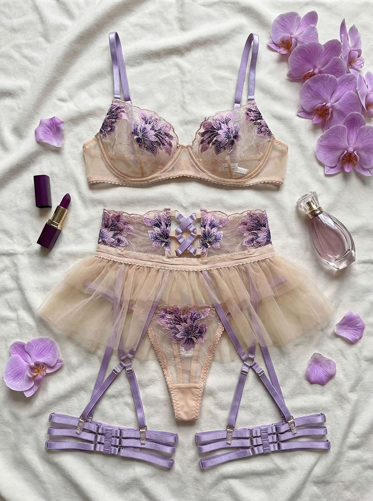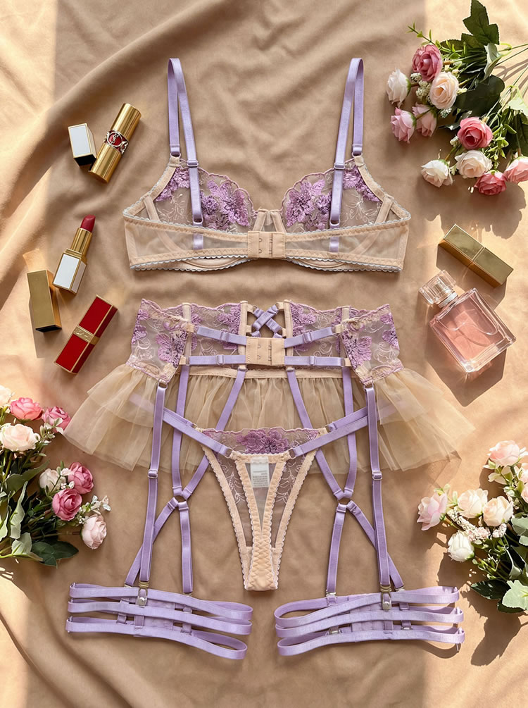 This romantic lingerie set features a delicate beige and lavender color palette, highlighted by intricate purple floral embroidery on the sheer mesh cups and briefs. The set includes a matching sheer tulle skirt attached to a wide, embroidered waistband with a decorative crisscross lace-up detail at the front. Adjustable garter straps connect the waistband to multi-strap thigh bands, creating a cohesive and alluring silhouette that balances sweet aesthetics with a daring design.