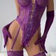 This striking lingerie set features a full-body corset-style bodysuit with intricate lace detailing along the front and sides. The design includes a deep V-neckline with adjustable spaghetti straps and a central lace-up panel that ties into a bow at the waist, allowing for a customizable fit. The sheer mesh panels highlight the silhouette while offering subtle coverage, and built-in garter straps securely hold matching lace-trimmed thigh bands. Paired with long, form-fitting gloves in the same rich hue, this ensemble creates a cohesive and dramatic look perfect for making a bold statement during intimate moments or themed events.