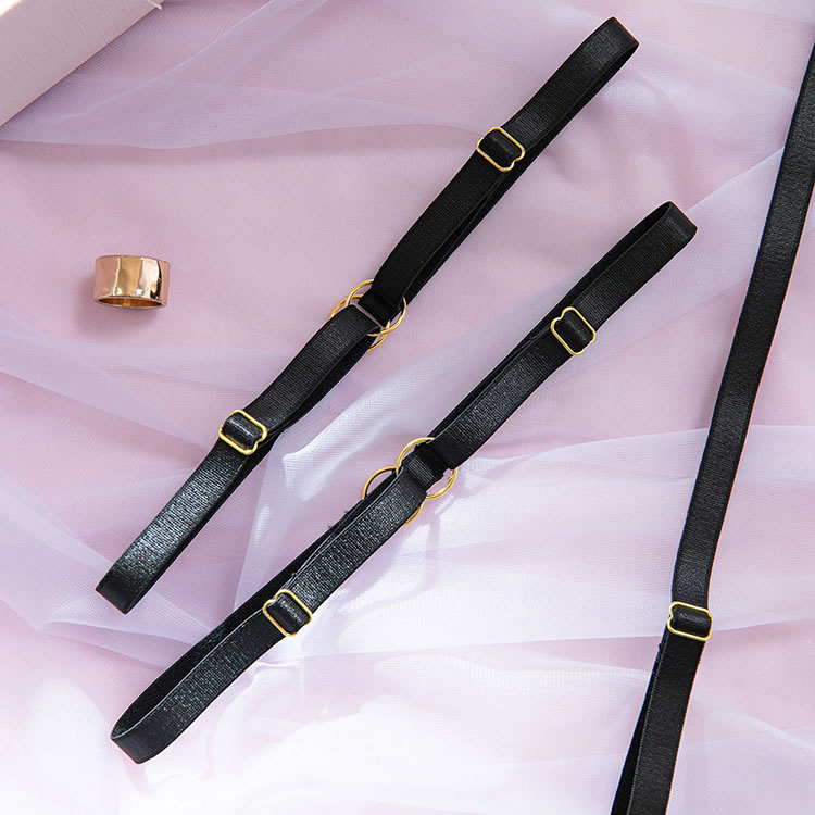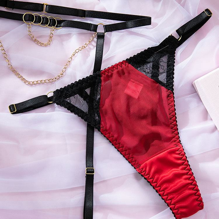 This striking lingerie set combines bold color blocking with edgy structural elements. The bra features a red mesh cup with sheer black lace panels, accented by a delicate chain that drapes across the front. The matching thong includes a central red panel and is connected to adjustable thigh straps that wrap around the legs, creating a dramatic silhouette. A wide waistband with metal hardware adds support and style, making this set ideal for those who enjoy confident, statement-making designs.