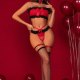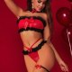 This eye-catching red and black lingerie set brings bold charm with its playful contrast of colors and classic lace detailing. Featuring a strapless bra adorned with a satin bow and delicate ruffled edges, it pairs perfectly with matching high-cut panties that highlight your silhouette. Ideal for a romantic night or a special celebration, this set makes a statement with every glance.
