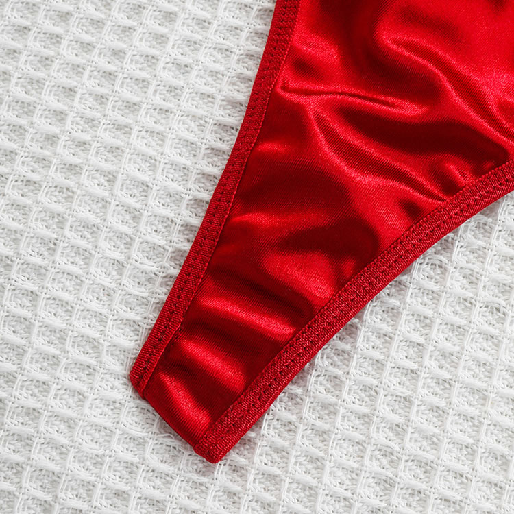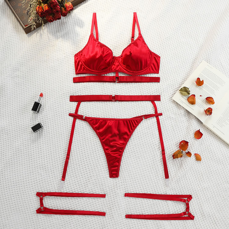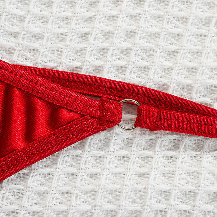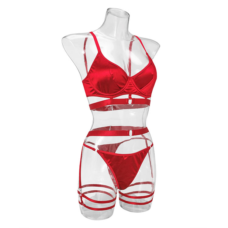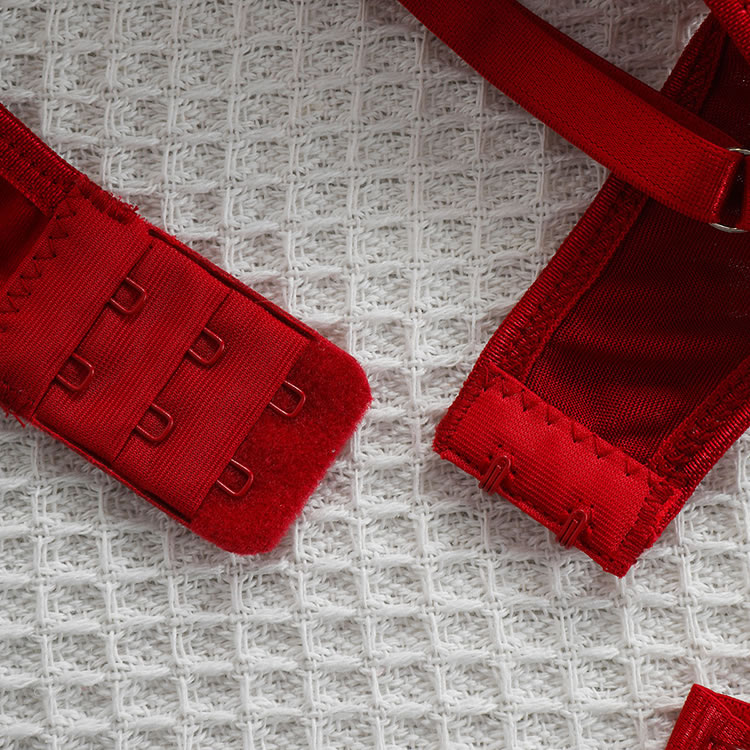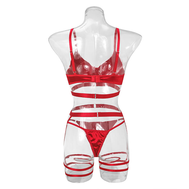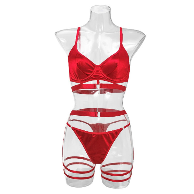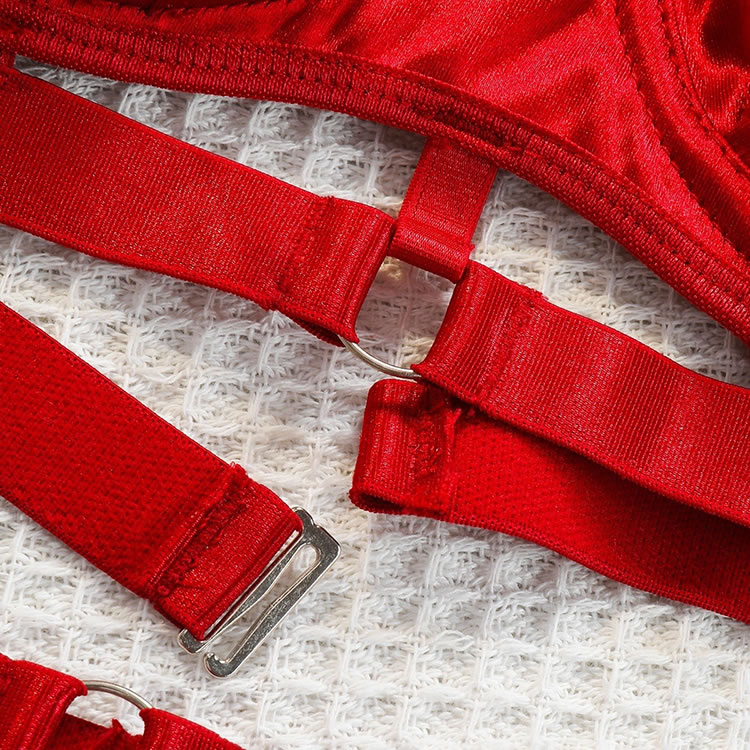 This eye-catching red lingerie set features a structured bra with a smooth finish and thin, adjustable straps that offer both support and style. The ensemble includes a matching thong, a midriff belt, and dual leg straps that create a bold, layered look. Designed for confidence, it highlights the body’s curves with strategic cutouts and metallic hardware accents, making it perfect for special moments or expressive self-expression.