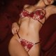 Unleash your inner confidence with this striking red floral lace lingerie set. This two-piece set features a sheer mesh bra adorned with intricate floral embroidery and charming white daisy appliqués that add a whimsical touch. The matching thong offers a cheeky cut with adjustable side ties, allowing you to customize the fit. The back of the bra is designed with a strappy racerback style, adding a modern and sporty flair to this classic romantic look. Perfect for adding a pop of color and romance to your intimate moments.