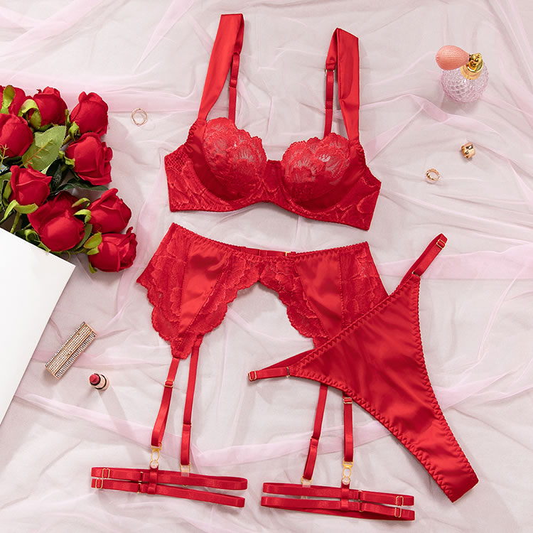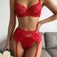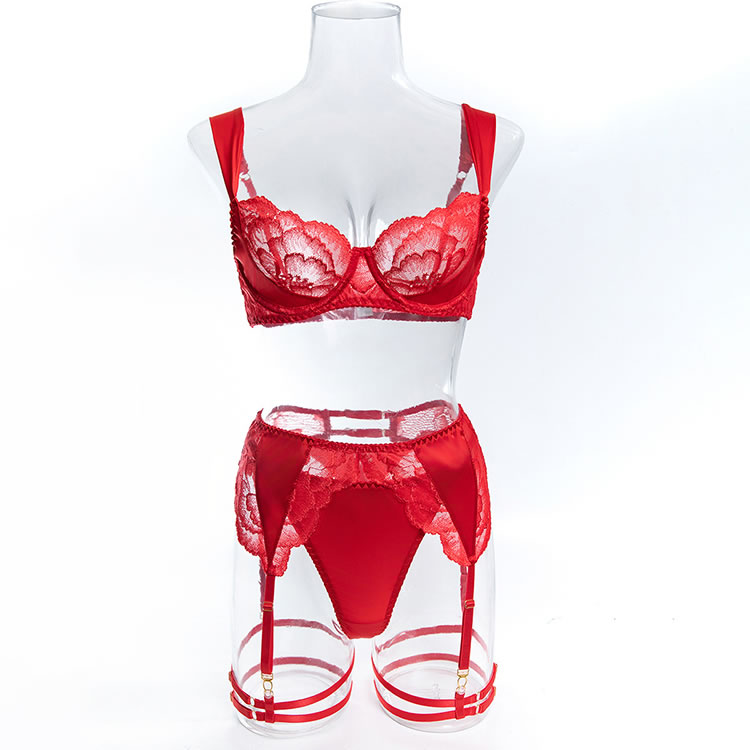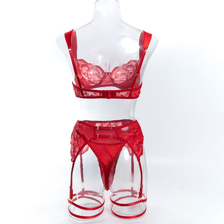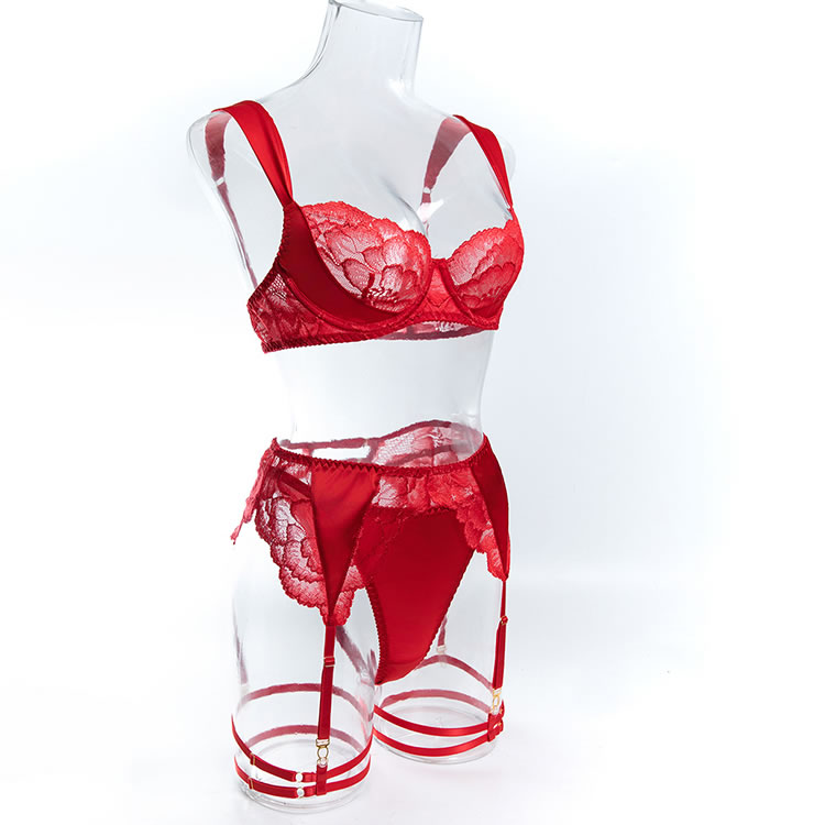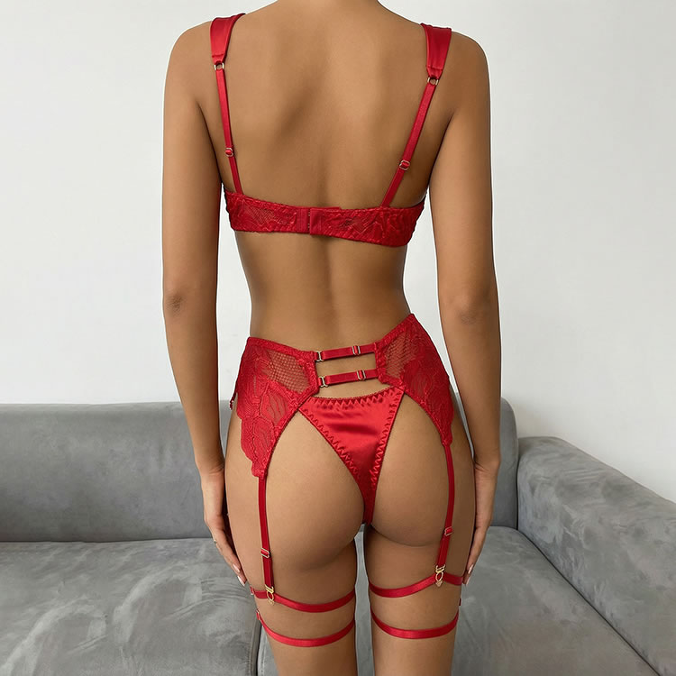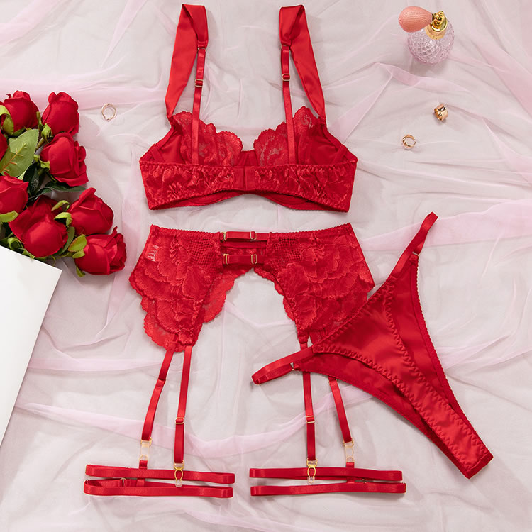 Command attention with this bold lace lingerie set. This three-piece ensemble features a balconette bra with sheer floral lace cups that offer a soft, romantic silhouette. The matching high-waisted garter belt is designed with a cheeky cut and sheer mesh panels, accented by delicate lace trim. The set includes adjustable garters and wide thigh straps, providing a customizable and edgy look. The back of the bra features a classic hook-and-eye closure with a strappy design that highlights the back. Perfect for adding a touch of daring elegance to your intimate moments.