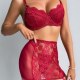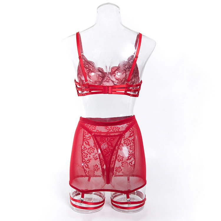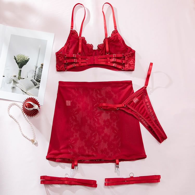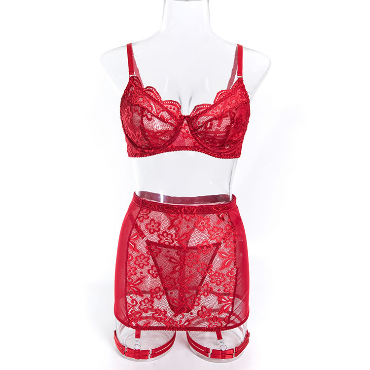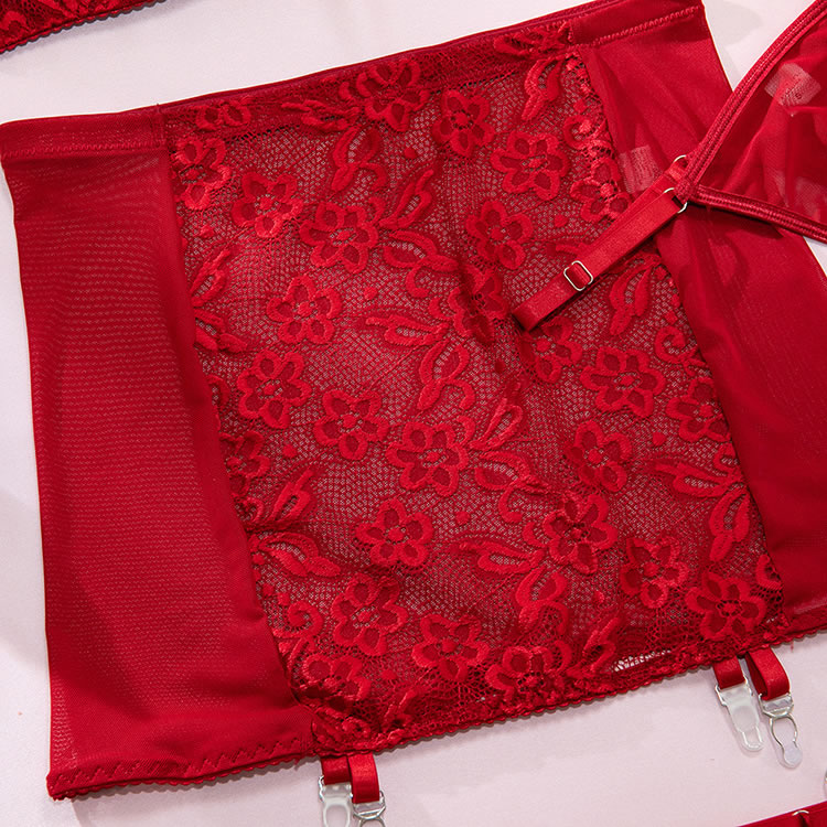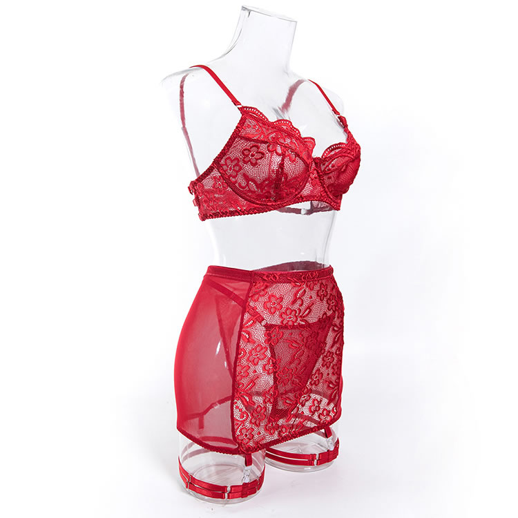 Showcase your confidence with this bold red lingerie set featuring a lace-adorned bra and sheer mesh high-waisted skirt. Designed with adjustable straps and garter attachments, it offers both style and comfort. The intricate lace detailing adds a touch of romance, while the mesh fabric enhances its modern, daring look. Perfect for those who love to make a statement.