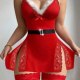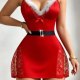 Step into the holiday spotlight with this striking red dress that blends classic Christmas style with a daring twist. Featuring a deep V-neckline edged in soft white fur and a bow at the center, it’s designed to turn heads. The fitted silhouette is accentuated by sheer lace panels on the sides and a high-cut skirt, while the black waistband adds a bold contrast. It’s perfect for festive parties, themed nights, or adding a touch of seasonal spice to your look.