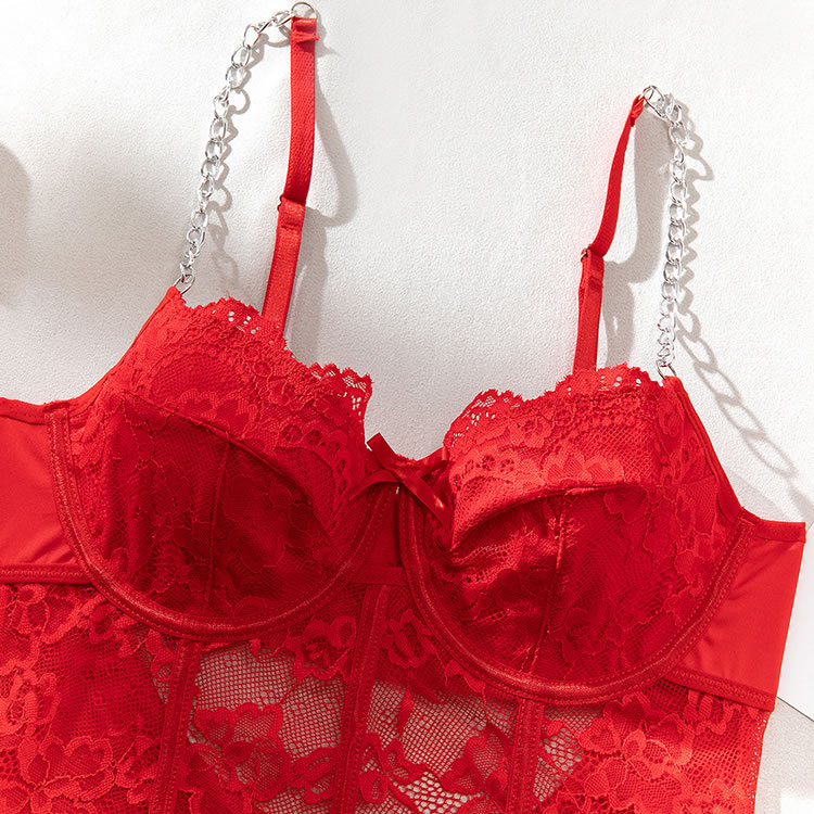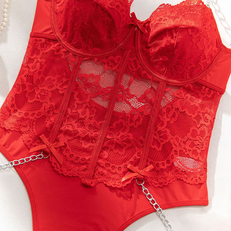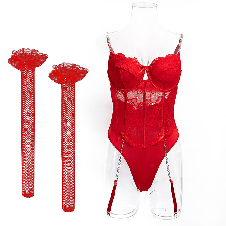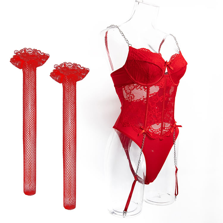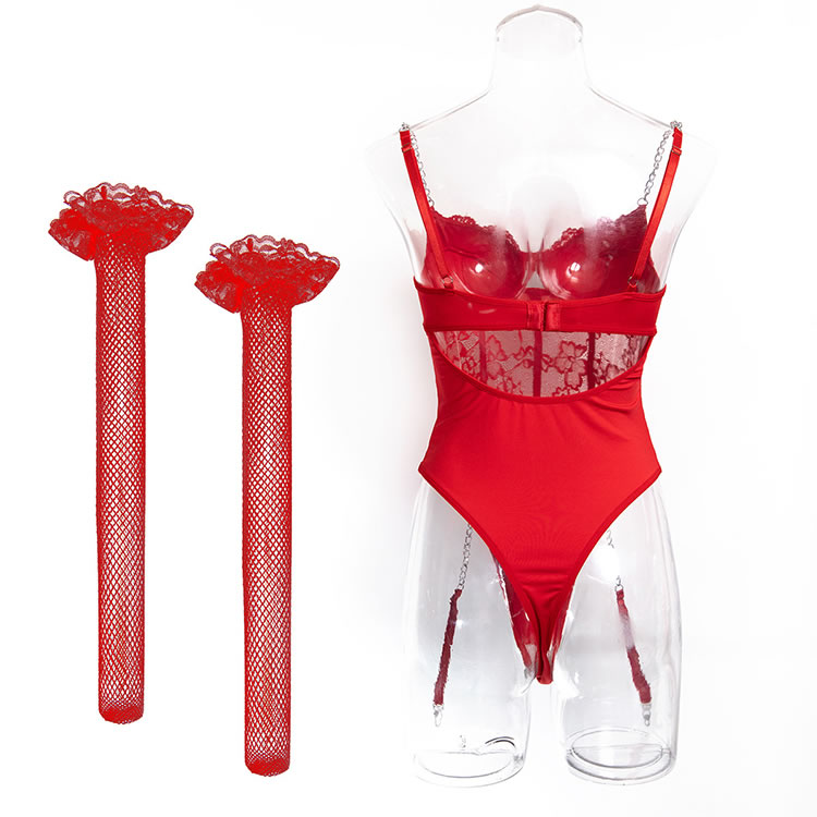 Step into bold confidence with this striking red lingerie set featuring a lace-trimmed bodysuit and matching fishnet thigh-high stockings. The design includes delicate chain details, a front cutout, and adjustable straps for a personalized fit. Perfect for making a statement, this set combines daring style with comfortable wear, ideal for special moments or adding a touch of drama to your look.