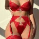 Showcase your style with this vibrant red lingerie set that blends classic design with modern edge. The underwire bra offers support with scalloped lace detailing and a decorative charm at the center. The matching high waisted garter belt includes a garter straps that connect to fishnet stockings, creating a cohesive and eye-catching look. Designed for confidence and flair, this ensemble is perfect for romantic evenings or making a statement during special occasions.